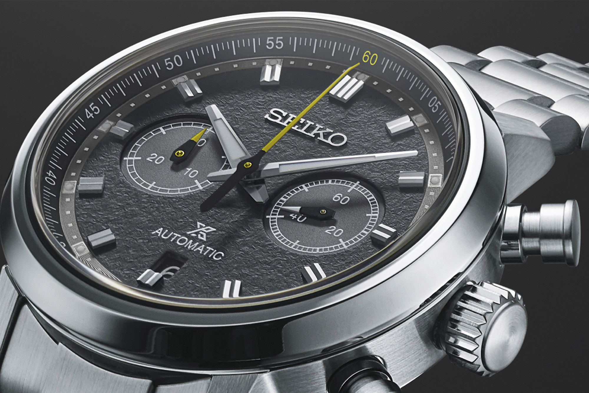 Une pièce dont on apprécie beaucoup le cadran. Un cadran à motif sablé, qui rappelle la piste de course, dont la trotteuse, l’aiguille du totalisateur des 30 minutes à neuf heures s’habillent de jaune, la couleur des appareils de chronométrage et de mesure Seiko.