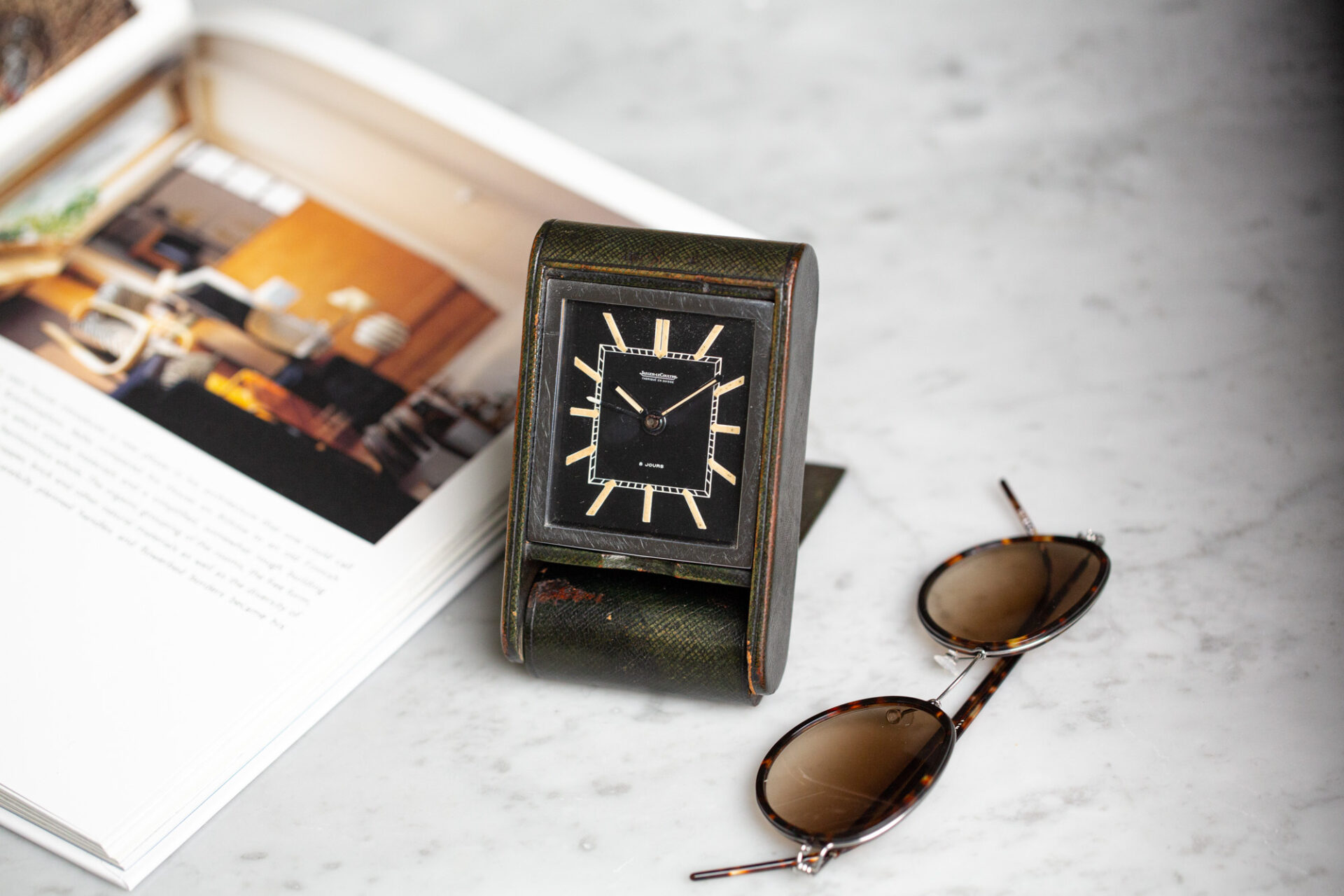 Voici un objet horloger au charme fou et à la belle sobriété. Une montre de table Ados à alarme et sa robe de cuir marron à fions croisillons signée Jaeger-LeCoultre, dans un état fantastique esthétique et de fonctionnement. Une pièce qui mérite de faire son apparition sur un bureau ou une table de chevet. Pratique et élégante.
