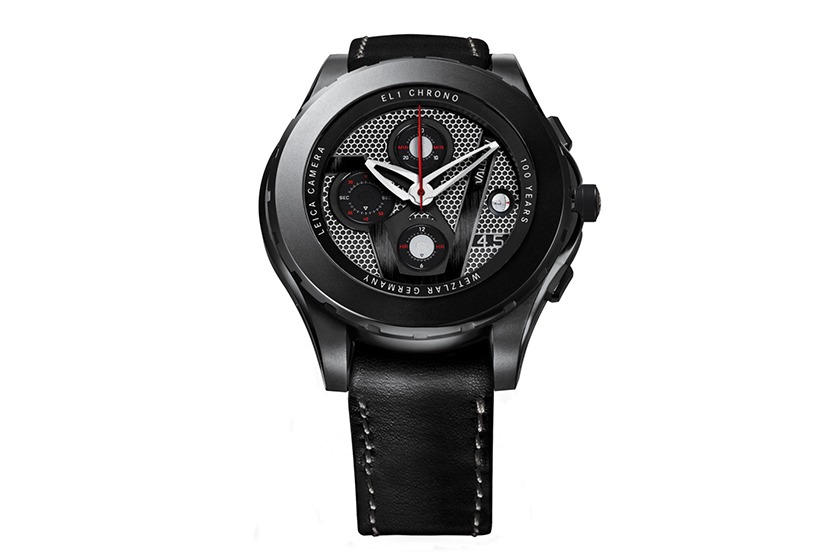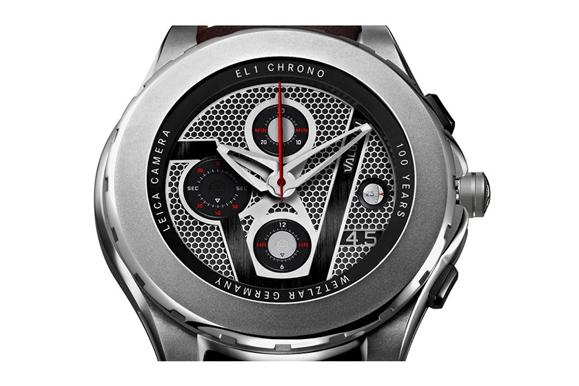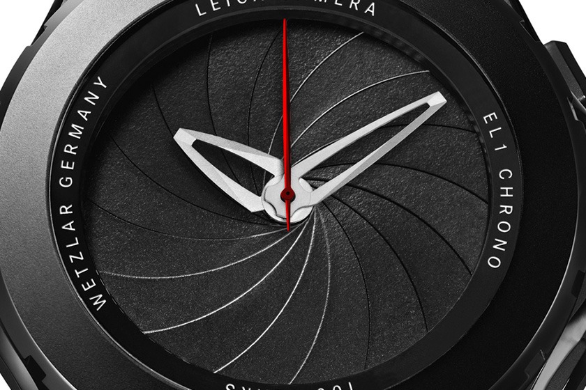 Crée en Titane grade 5 sablé et microbillé, la montre présente quatre gravures blanches sur son rehaut, une chaque quart du temps. Les détails du cadran sont des rappels stylistiques des appareils photo Leica. L’indication de la date (à 3h), le cadran des minutes (à midi), et celui des heures (à 6h) rappellent le lay-out des réglages. Le cadran des secondes (à 9h) s’inspire du design du disque de réglages de l’isométrie. Enfin, l’applique 4,5 positionnée à 4 heures et demi, évoque le chiffre d’ouverture du diaphragme du premier Leica.