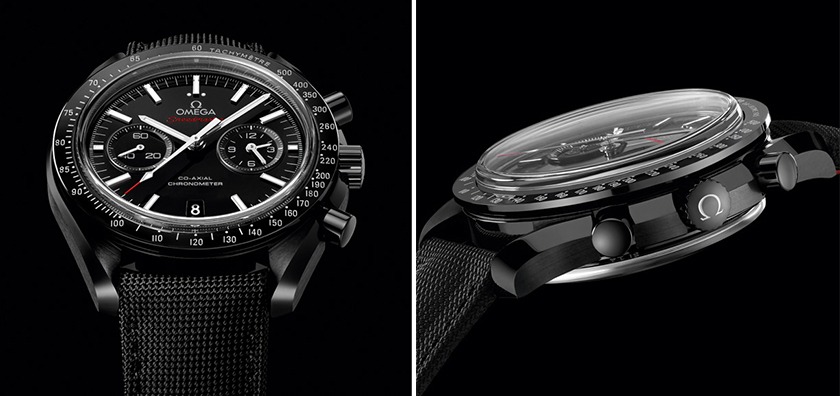 Son boîtier en céramique d’oxyde de zirconium noir, mesure 44.25mm. Il dispose d’une lunette pourvue d’une échelle tachymétrique en nitrure de chrome mat et d’un verre saphir avec revêtement antireflet. Les aiguilles et les index appliqués sont en or blanc 18 cartas. Il est étanche jusqu’à 50 mètres. Le fond saphir possède l’inscription « Dark Side of the Moon ».