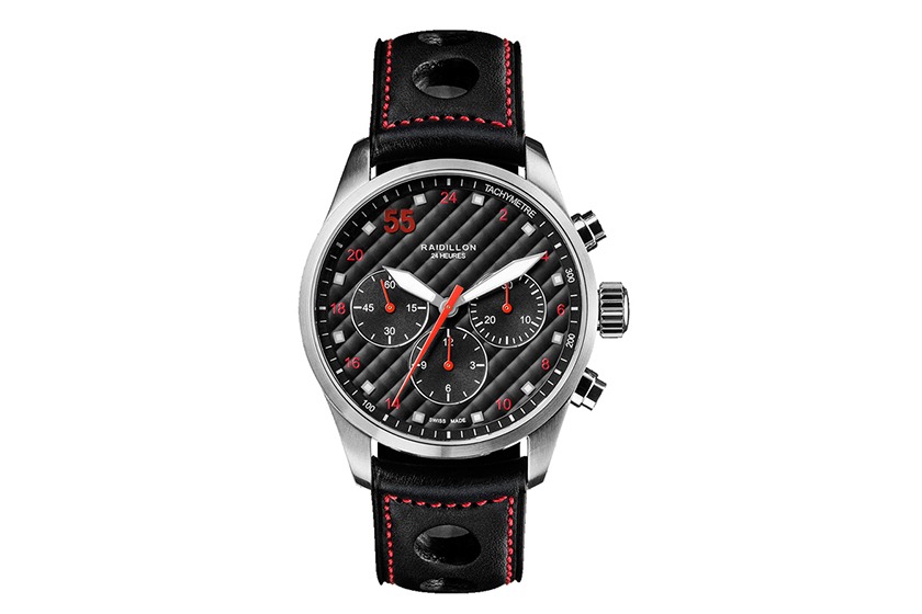 Hommage aux courses du Spa Francorchamps et des 24 Heures du Mans, ce garde-temps Raidillon embarque un calibre Valjoux 7750 modifié pour fonctionner sur un format 24 heures.
