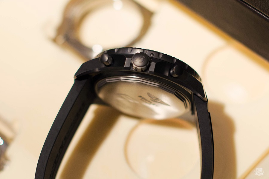 Au centre de l’attention ce soir, la Breitling Bentley GT3, hommage de Breitling à, vous l’avez deviné, la Bentley continental GT3 et aux victoires du constructeur en courses auto. On retrouve évidemment la lunette iconique des éditions Breitling for Bentley qui reprend les caractéristiques historiques de la célèbre calandre anglaise. La boite, en titane cette fois-ci et recouverte d’un traitement DLC noir, a une ouverture de 49mm. Pas exactement une « petite » montre dans la catégorie vintage mais plutôt un chrono ultra sportif pour les gros joueurs. La construction en titane (légerté) et la position des cornes (confort), la rend néanmoins très agréable à porter, à défaut d’être invisible.