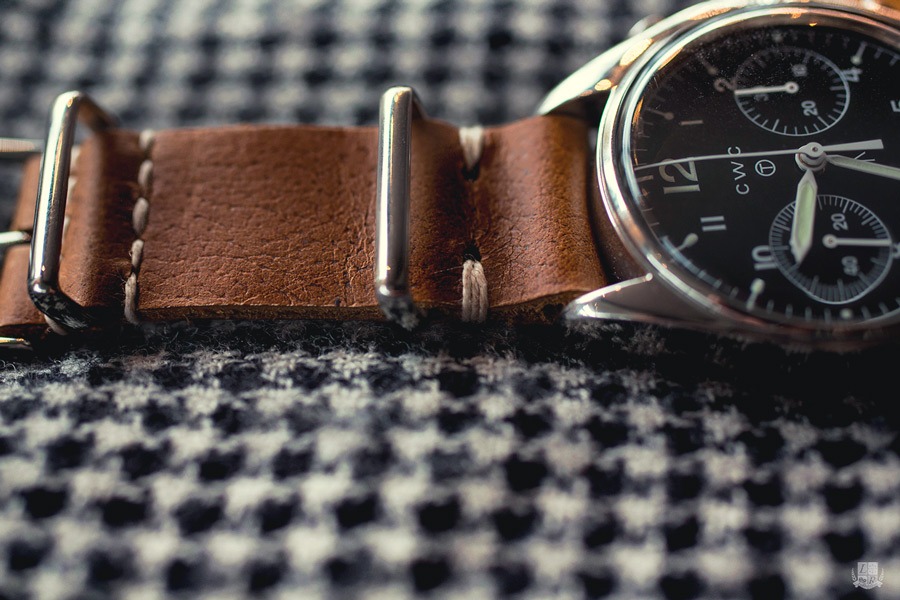 Noir mat, deux compteurs. On retrouve une petite seconde constante à 9h et le compteur 30min du chronographe à 3h. Au centre du cadran, comme à l’origine, la broad arrow militaire à 6h et le « T » indiquant l’utilisation de Tritium comme matière photo-luminescente. Ce que ça change ? Dans quelques dizaines d’années, en vieillissant, le centre des aiguilles, le 12, le 6 ainsi que les 10 indices marquant les heures vont prendre cette belle patine « coquille d’oeuf » qu’on aime tant chez nos compatriotes vintage. Cela ne se produit que très peu, voir pas du tout avec l’utilisation de « Super-luminova ».