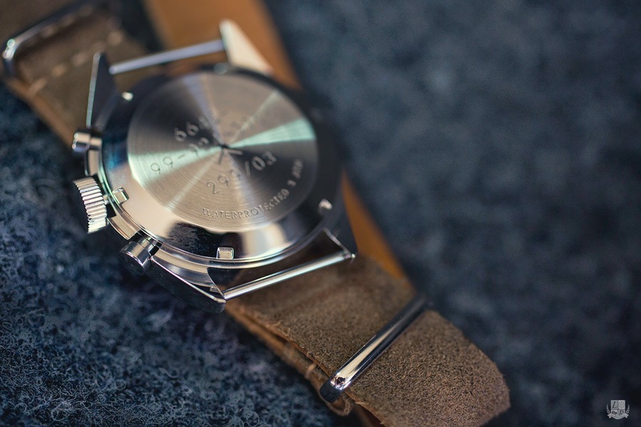 Le fond vissé reprend les marquages militaires historiques, même si bien évidemment, cette montre n’a jamais été mise en service. Certains le critiqueront mais je ne trouve personnellement pas désagréable de retrouver la « broad arrow » gravée au dos de la boîte.