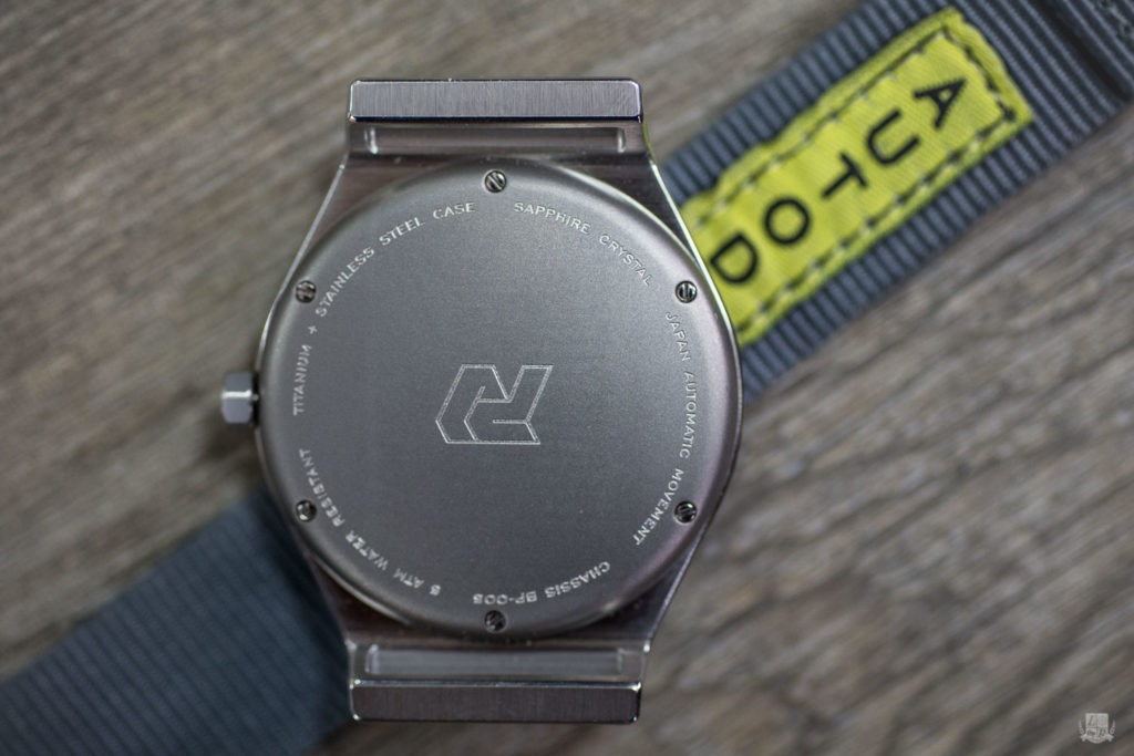 Le boîtier est superbe. Grandiose peut-être même, et digne des plus grands noms de l’horlogerie en terme de conception et de design. Un boîtier très bien pensé, en trois parties, qui nous rappellerait presque (complètement) les designs d’un certain Gerald Genta… Vous en avez peut-être entendu parler ? C’est une construction en trois parties que l’on observe ici, le fond de boîte ainsi que la lunette sont en titane micro-billé, et son tous deux vissés à la boîte en acier.