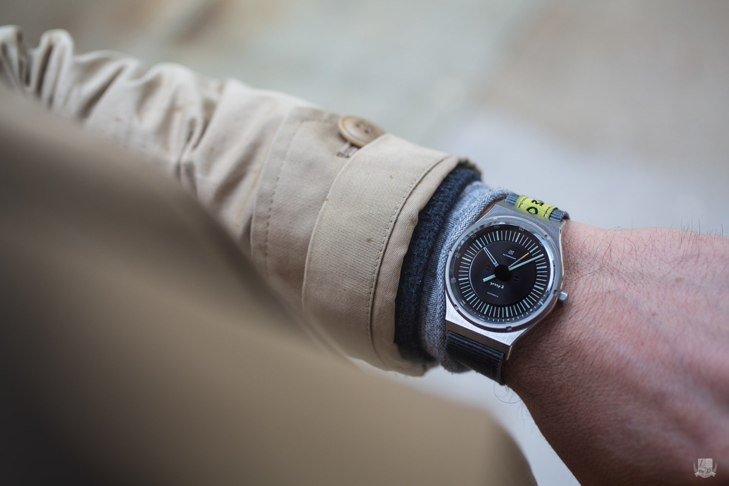 En hommage à la catégorie automobile expliquée ci-dessus, l’Autodromo Group B Automatic reprend divers codes de l’automobile, en commençant par le bracelet. En nylon, celui-ci rappel les harnais de course, rappel appuyé d’un écusson brodé avec l’insigne Autodromo jaune et noir en son intérieur (qu’on peut d’ailleurs retourner, pour se rapprocher un peu plus des grands pilotes…).