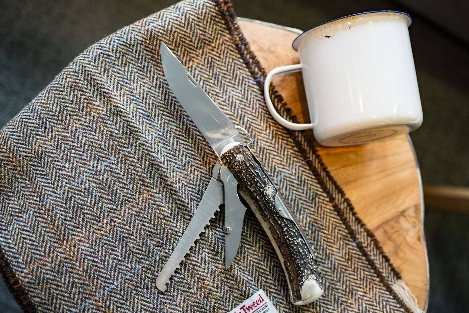 La célèbre goupille de déverrouillage du système de blocage de la lame récurrente de création Mongin et du couteau original n’est pas un hasard. On y retrouve tous les outils du pliant de l’écrivain, un magnifique bois de Cerf rugueux qui accroche bien en main et le célèbre pommeau, qui’ n’est évidemment plus en ivoire. Nos amis les éléphants vous remercient.