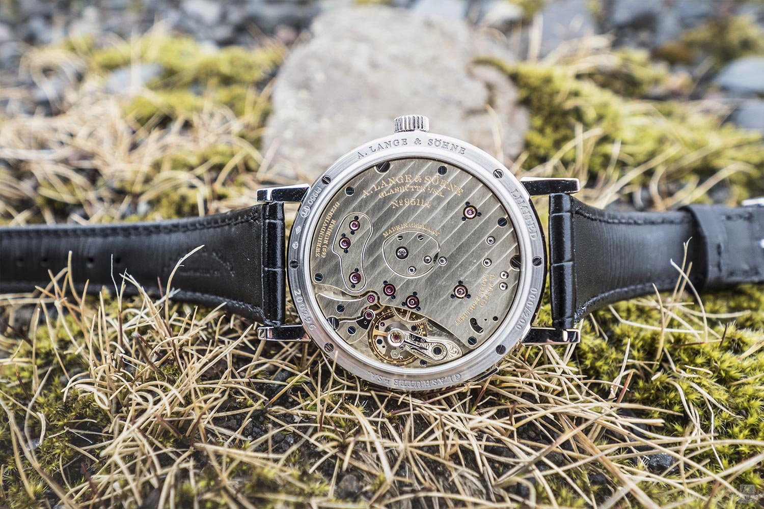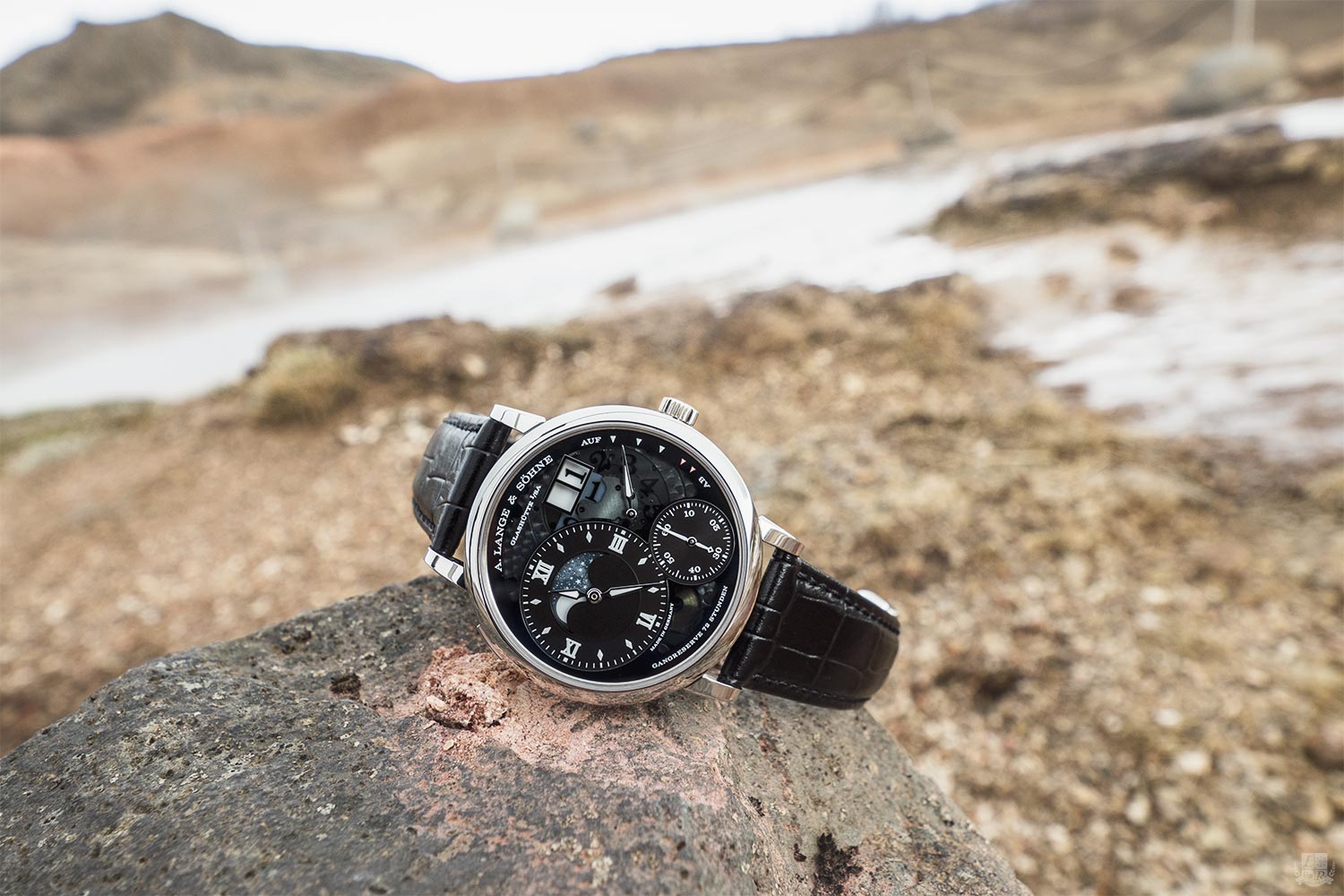 Avec la Grand Lange 1 Lumen, A. Lange & Söhne a pris le contre-pied de l’existant et a développé un cadran en verre saphir teinté noir qui laisse néanmoins passer la lumière qui chargera la base photo-luminescente du disque de phase de lune, ainsi que les index, les aiguilles et surtout les deux guichets de la grande date qui une fois la nuit tombée révèlent d’une bien belle façon de connaître le jour du mois…