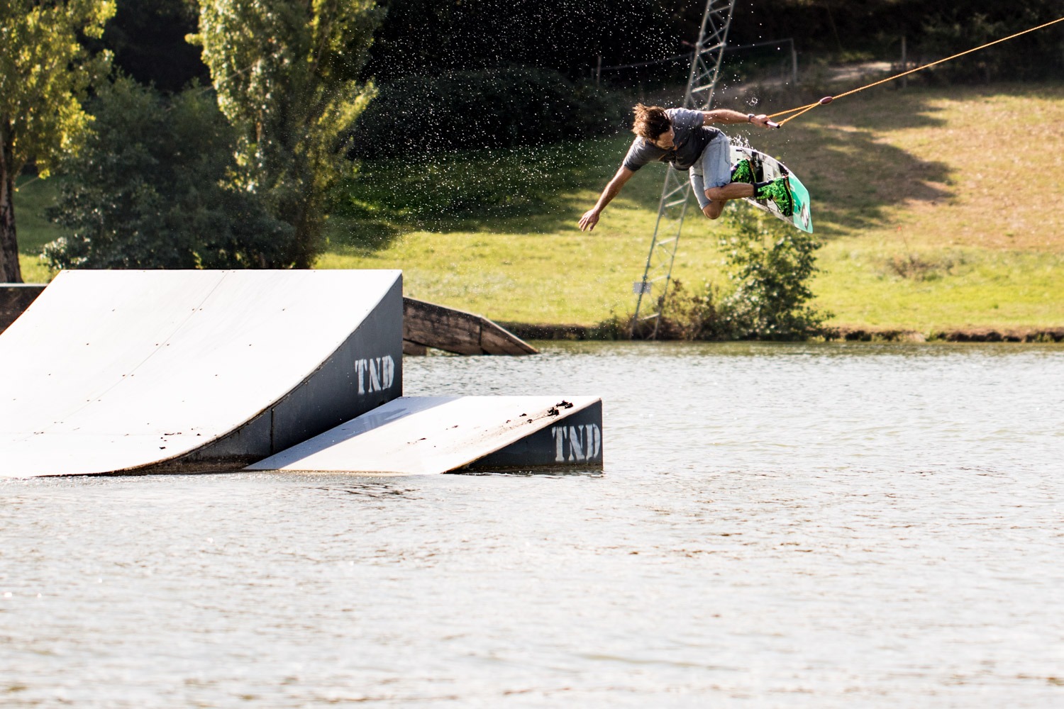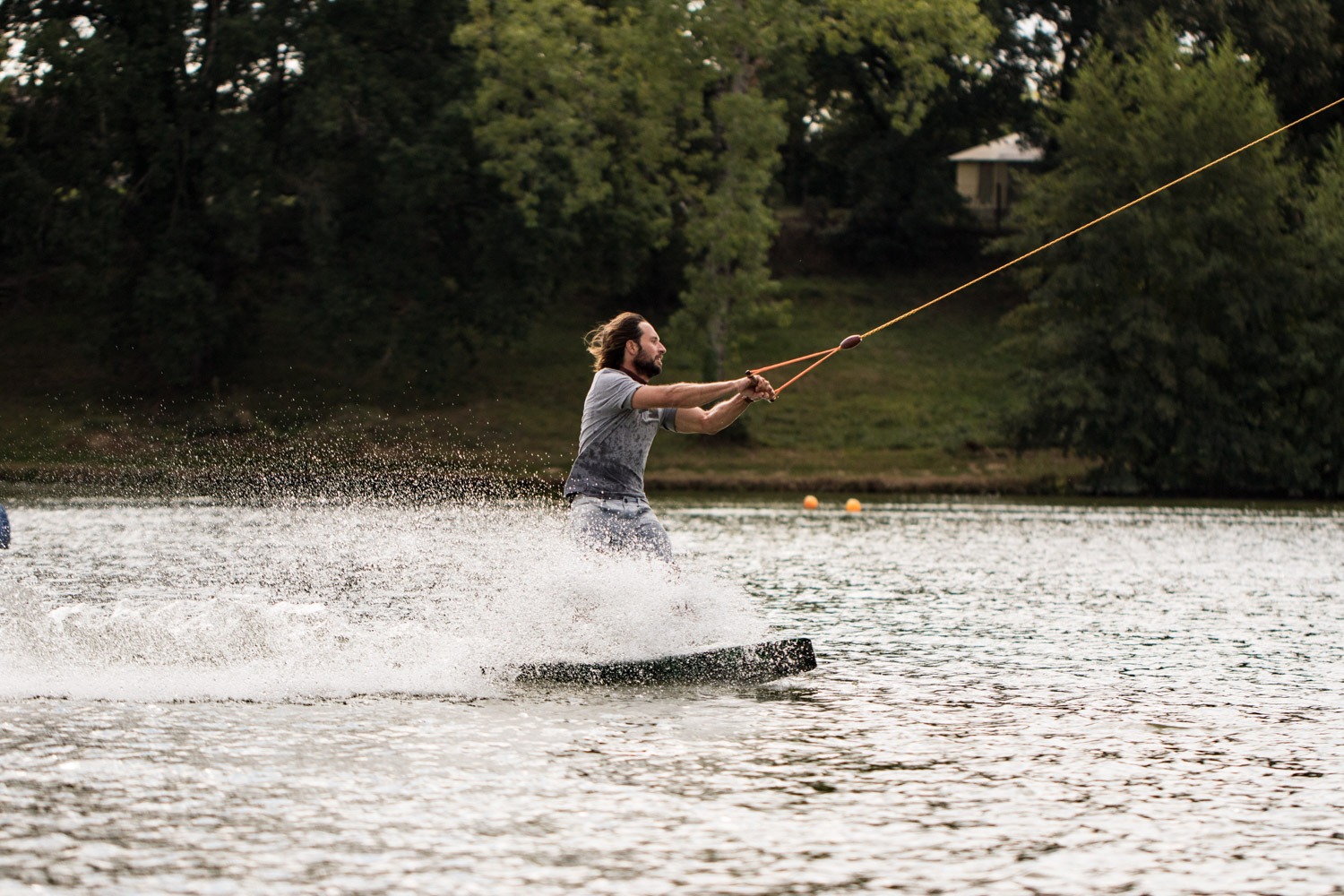 Hugo, c’est le Snowboarder qui en avait assez d’avoir froid et qui a consacré ses derniers 20 ans à ce sport de glisse nautique, à parcourir le monde de championnat du monde en championnat du monde. Il a le look du rider californien et le sourire facile et constant de celui qui aime passionnément ce qu’il fait. Un plan d’eau, une board, un système de poulies, de câbles et de cordes, un bon café et des amis qui partagent et vivent de cette passion pour la glisse. Voilà qui pose le décor. Je ne vous cacherais pas qu’après ces quelques heures passées en compagnie de la joyeuse bande, nous avions plutôt très envie, nous aussi, de nous aventurer sur ce lac « miroir » en attrapant la première corde du matin. Guilty