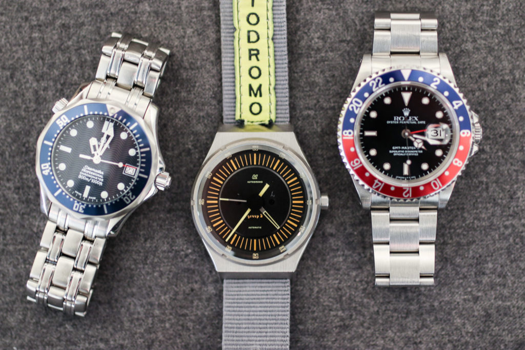 Commençons par une Autodromo Group B. Cela correspond un peu à ce qui l’anime. Une montre automatique, avec un esprit bien racé, qu’il aime porter avec le bracelet en tissu avec son cousu « Autodromo ». Une belle pièce, en accord avec son image.