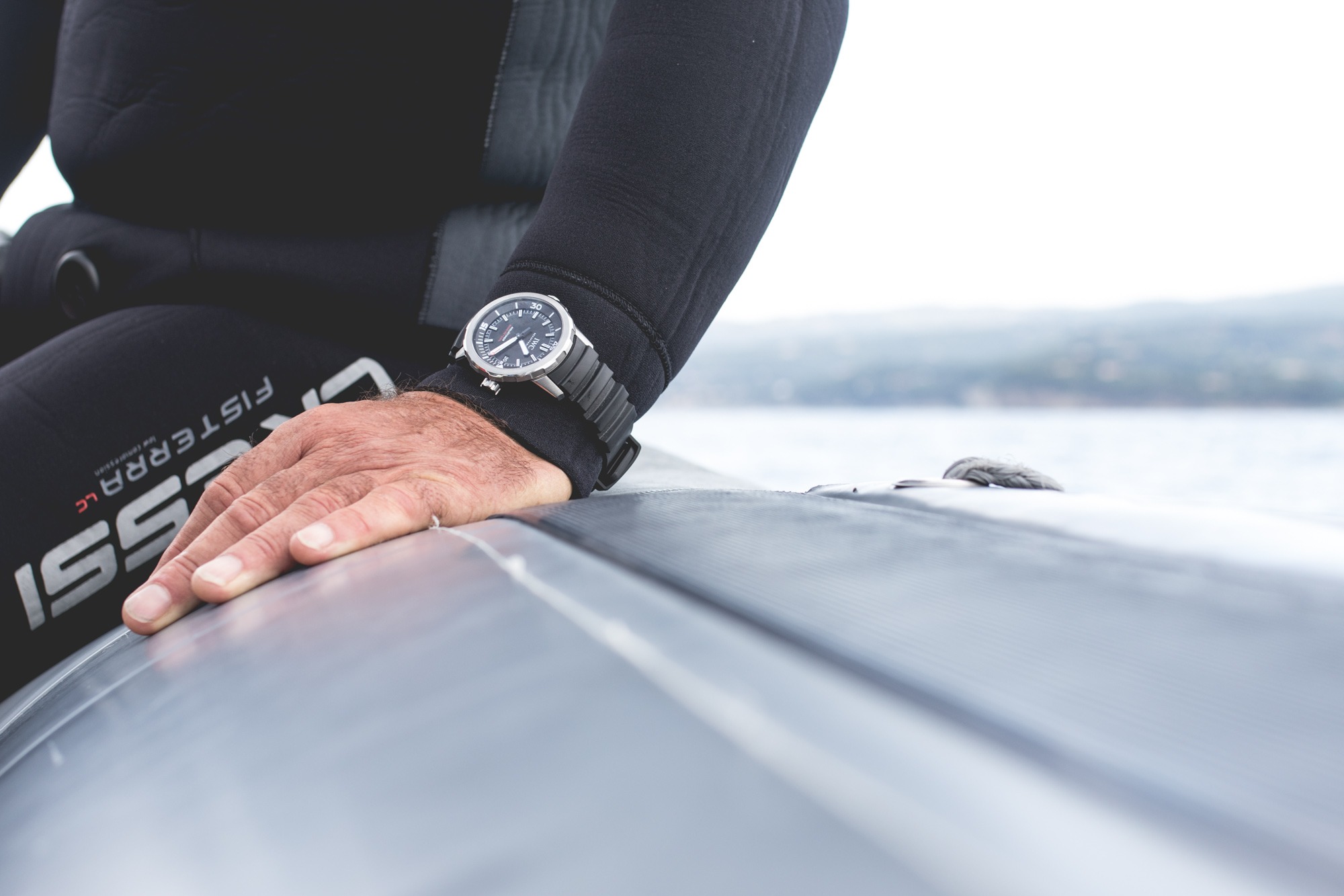 Choisie par Luc Vanrell pour cette plongée à -40m, une Aquatimer Automatic 2000. Une édition limitée à 350 exemplaires, en titane, de la célèbre montre de plongée de la Maison de Schaffhausen. Extrêmement lisible, léger et robuste, le diver a fait l’unanimité chez le plongeur et ses compères. Le meilleur test possible, si vous me permettez !