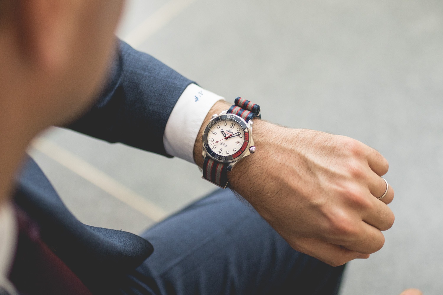 On retrouve donc du rouge, à la fois sur la ligne ‘Seamaster’, mais également sur l’aiguille des secondes terminée du logo 007, et sur le premier quart de la lunette unidirectionnelle. Qui se prolonge jusque dans le bracelet en tissu fourni dans la boîte.