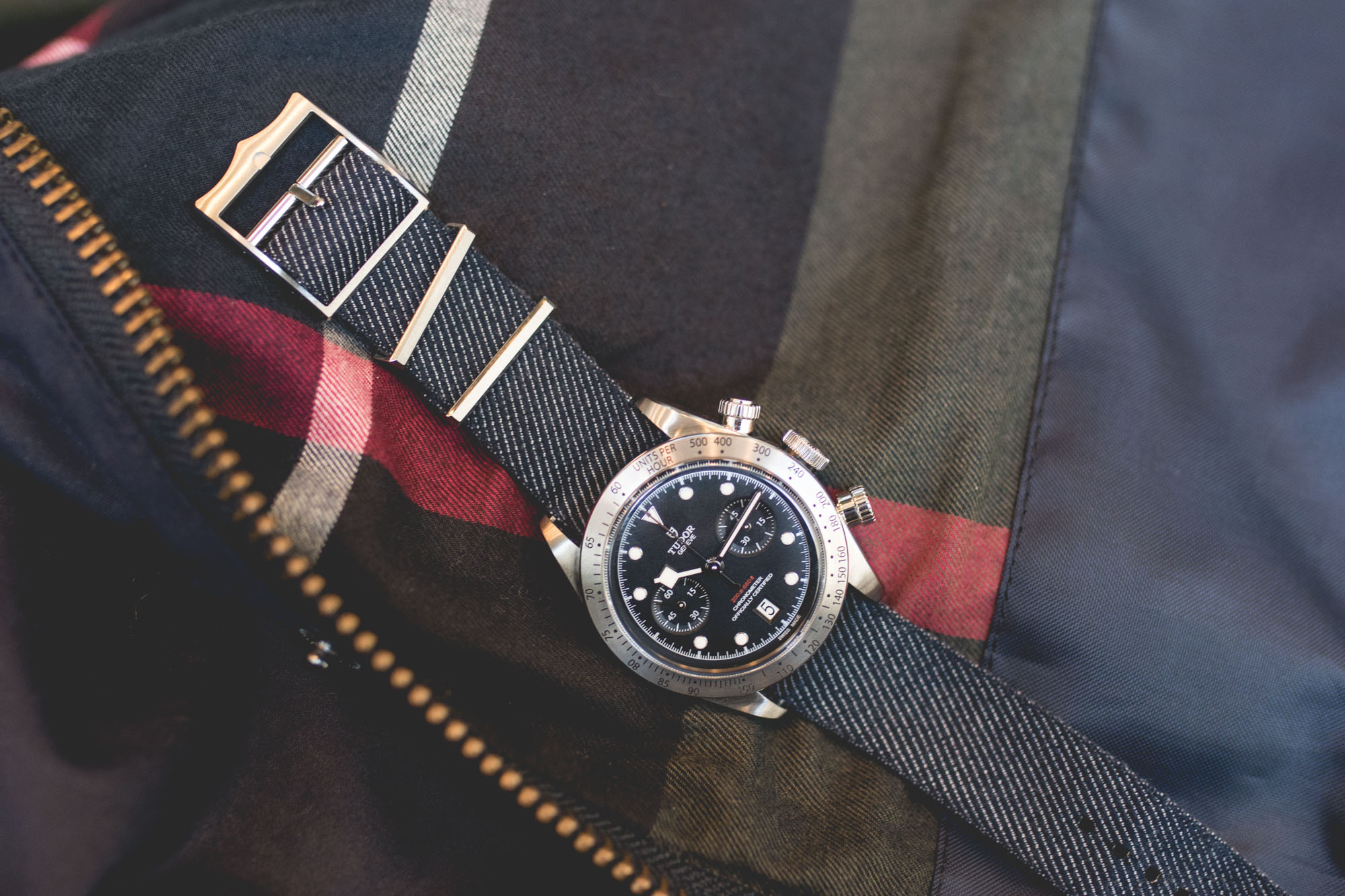 Notre choix horloger s’est arrêté sur la Tudor Black Bay Chrono. Pour quelle raison ? La veste est sobre, robuste jusque dans la moindre activité un tant soit peu dynamique, et se marie à merveille avec une foule d’autres vêtements. C’est un match avec la Tudor.