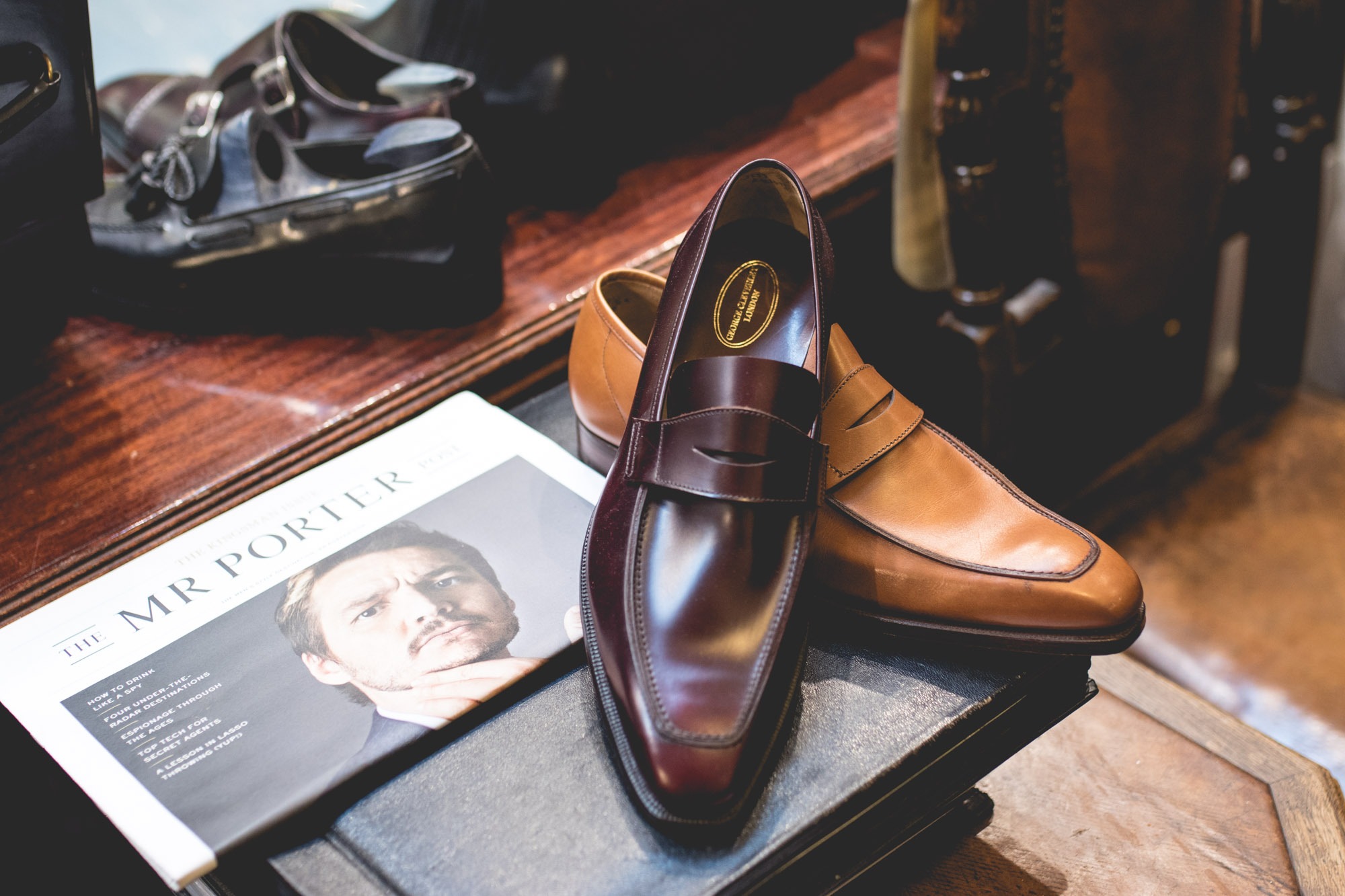 Premier arrêt. Nous prenons grand plaisir à nous balader dans Mayfair et sur Piccadilly Circus, pour arriver à la Royal Arcade par Old Bond Street. Ce vieux passage datant de la deuxième moitié du XIXe siècle accueille de beaux noms du savoir-faire anglais, parmi eux George Cleverley. C’est le vendeur en prêt-à-porter qui nous ouvre la porte chaleureusement ‘Hey chaps!’. Pour vous décrire le lieu, il me fait penser à une boutique du Chemin de Traverse dans Harry Potter.