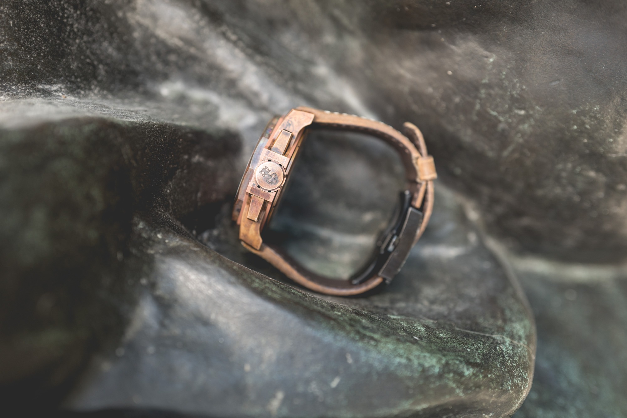 Parlons peu, parlons du boitier en bronze. Ce n’est pas n’importe quel bronze, et Dieu est plus que jamais dans les détails. Ce bronze et d’abord stabilisé, c’est à dire que les teintes ne partiront pas dans la direction « Art Contemporain » avec des couleurs trop foncées tirant sur le vert. Ce qui permet à Corum d’équiper le fond de boîte avec du bronze, quand d’autres marques ne peuvent se le permettre car le trop grand contact avec la peau pourrait avoir des effets indésirables sur la montre, et les vêtements.