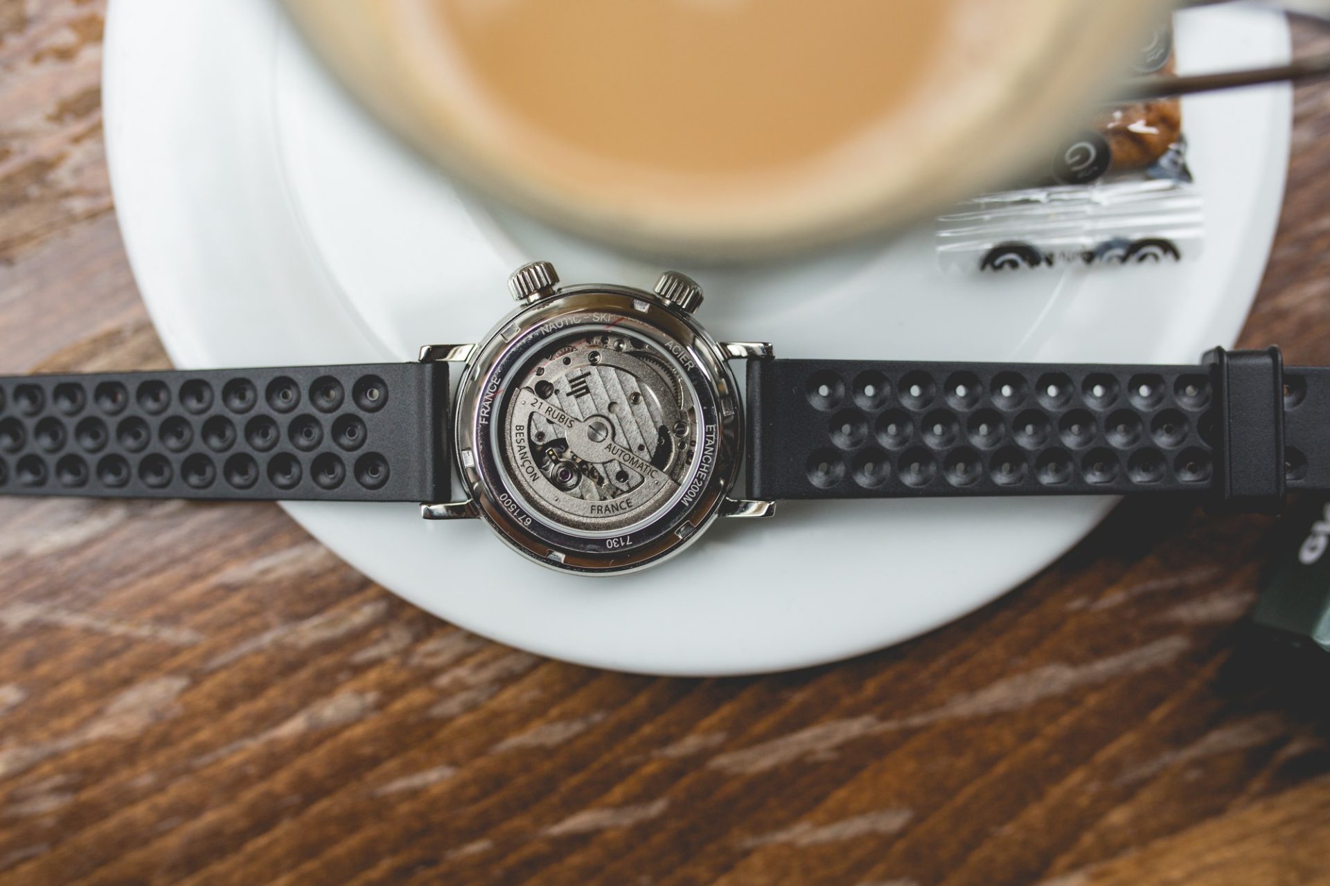 Le mouvement automatique est de conception japonaise, Miyota 821A pour les curieux. On aurait eu un petit verre plexiglas et un fond plein que l’équation aurait été proche de la perfection ! Pour 499€, on peut partir sereins à la pêche aux coquillages, et c’est finalement le plus important.