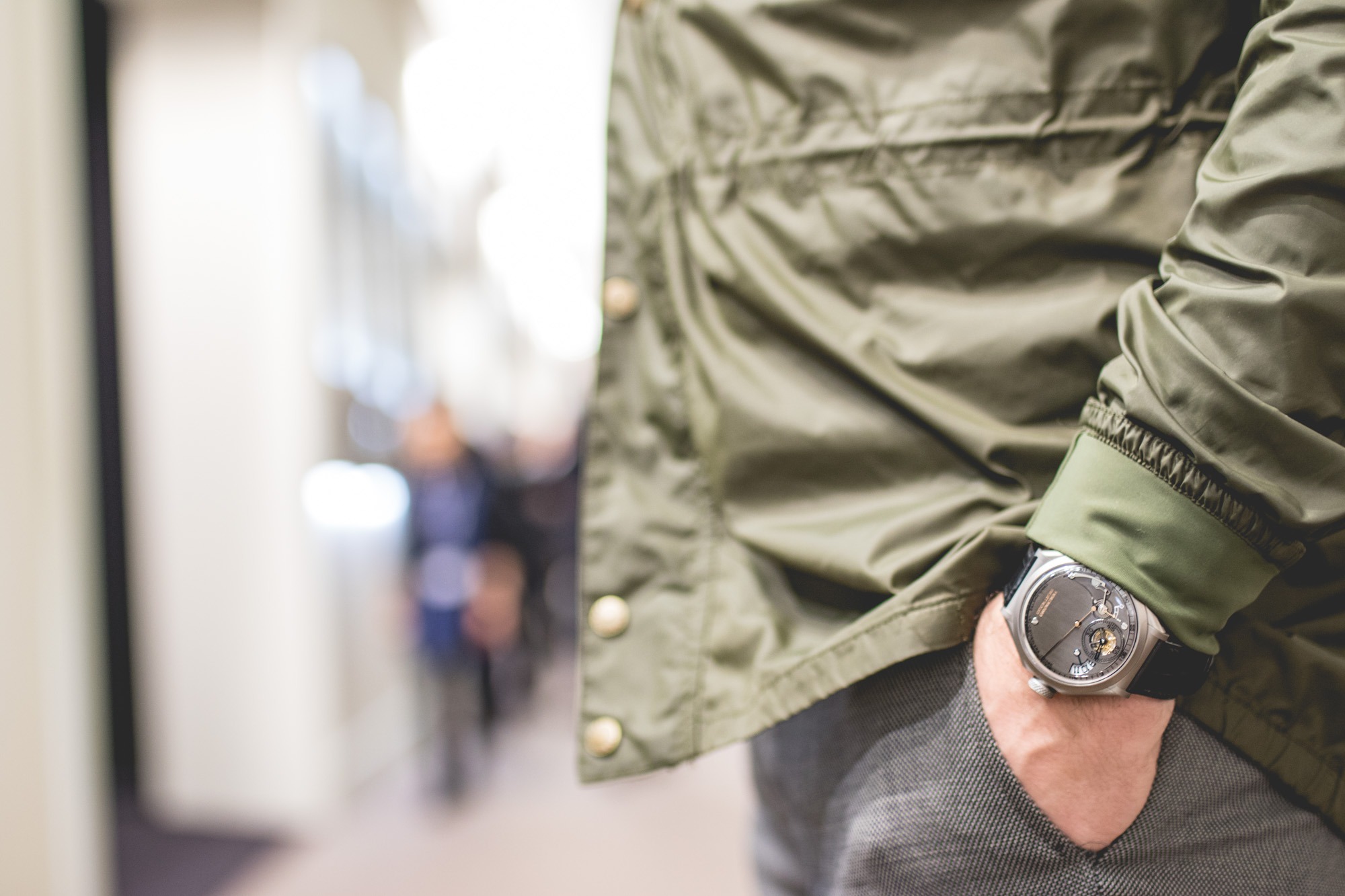 Commençons par les choses simples avant de parler fusée et chaînes, le voulez-vous ? Ce que nous avons entre les main n’est rien d’autre qu’un régulateur. Autrement dit, les aiguilles des minutes et des heures ne sont pas coaxiales. En général, et comme il est souvent le cas, la seconde est centrale et les minutes se lisent dans un autre guichet, ici à midi. Les heures se lisent dans un guichet à deux heures. Au delà cette complication, ce n’est pas ce qui impressionne la galerie ici.