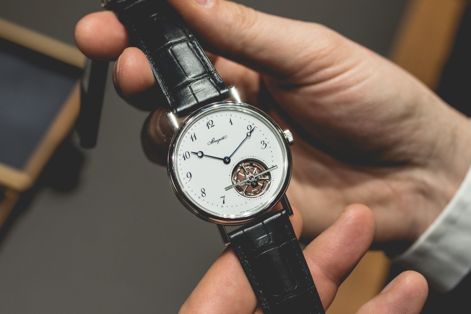 Ici, le tourbillon ne pouvait pas venir seul, alors il est venu accompagné d’un sublime cadran en émail grand feu. Détail toujours aussi plaisant de ce cadran, les aiguilles heures/minutes excentrées pour être en harmonie avec le tourbillon.
