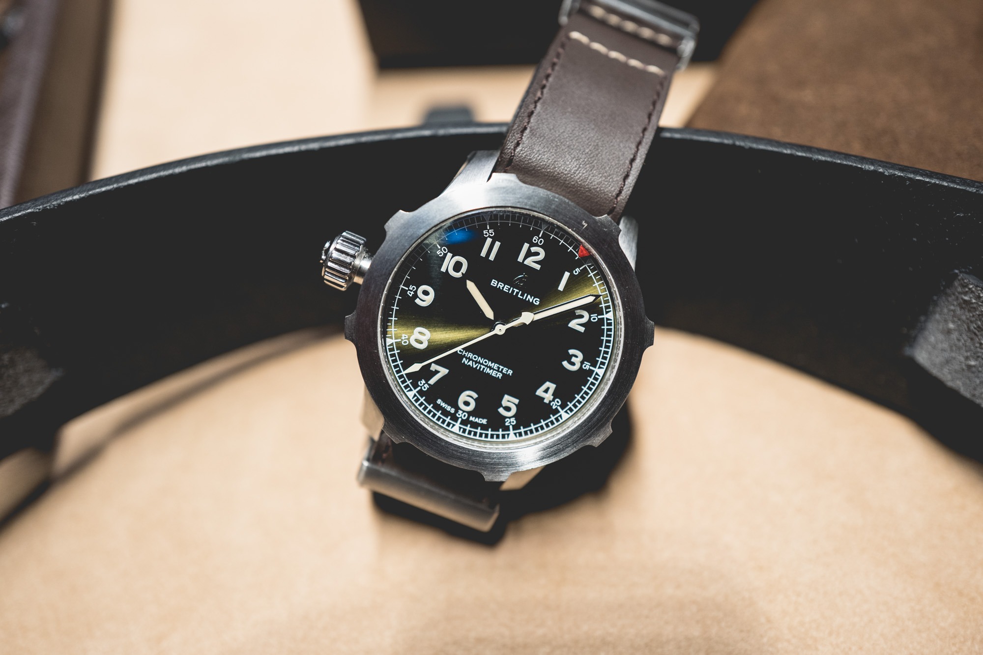 Une pièce assez surprenante est présentée cette année, et elle fait référence aux pièces portées par les pilotes sur leur cuisse. À l’époque, il ne s’agissait pas d’une montre mais d’un compte à rebours pour les pilotes de bombardiers, afin de savoir exactement quand envoyer les bombes. On s’en servira autrement. Elle reprend les codes Navitimer 8, avec un calibre maison B20, une lunette bidirectionnelle et trois aiguilles. « Simplement ».