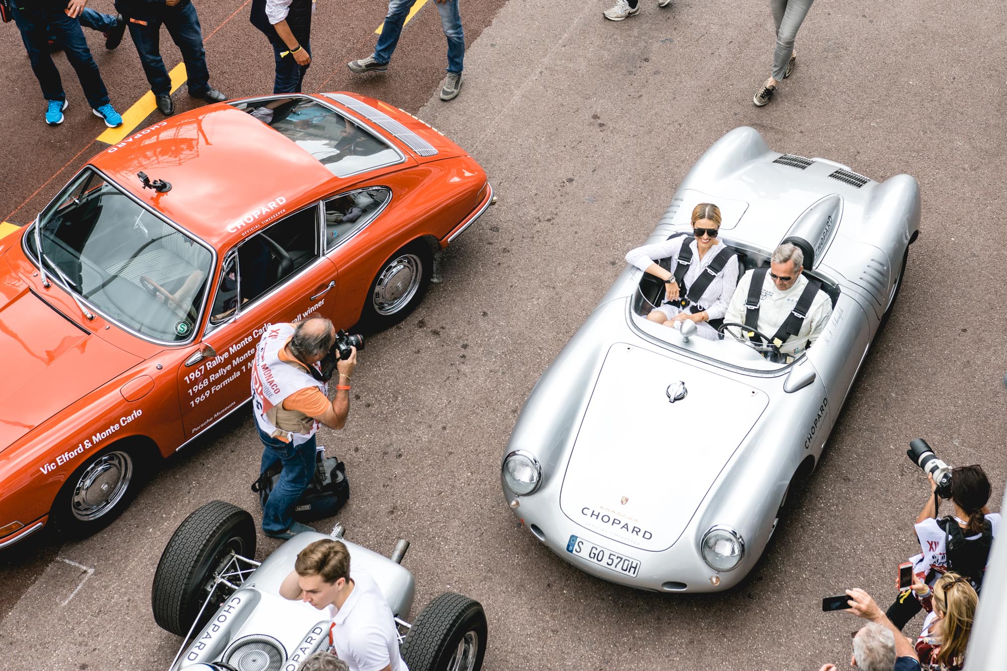 Pour les lier, Karl-Friedrich Scheufele assure aussi une belle prestation au volant de sa Porsche 550 Spyder, faisant rugir le 4 cylindres de celle-ci accompagné de la délicieuse Petra Nemcova.