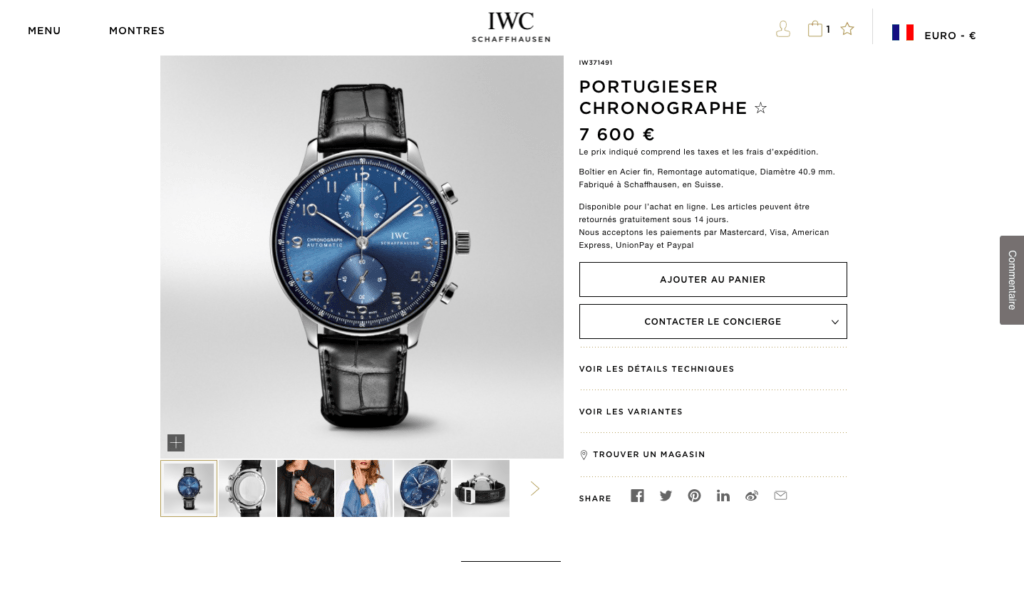 Je parlais justement à titre de hasard d’une IWC Portugaise parce que tout le monde la connaît. Et je propose que nous prenions comme exemple le site e-commerce d’IWC. IWC a présenté sa nouvelle plateforme de e-commerce il y a tout juste quelques mois. Rien d’étonnant quand l’on voit que la marque avait aussi proposé à la vente ses montres sur MR. Porter quelques mois plus tôt, comme d’autres marques du groupe Richemont.