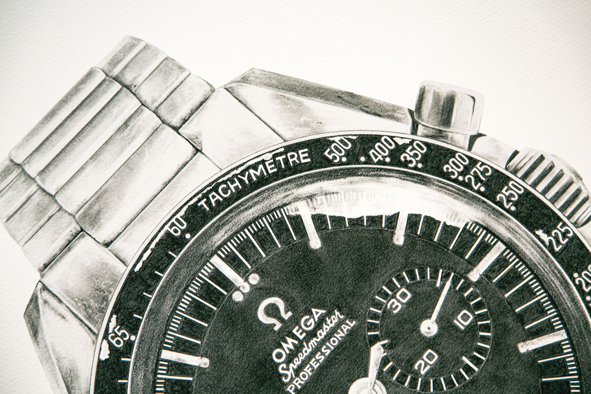 Mais ce n’est pas tout. Cette vénérable Omega Speedmaster est marquée par les traces du temps. Un challenge que Constance à relevé avec brio. Qu’il s’agisse d’un accroc sur l’insert en aluminium de la lunette ou sur la boîte en acier, ou le vieillissement d’un index tritium qui s’empâte et a du mal à gravir sa marche, chaque détail reproduit ici contribue à donner à cette oeuvre le supplément d’âme qu’elle mérite.