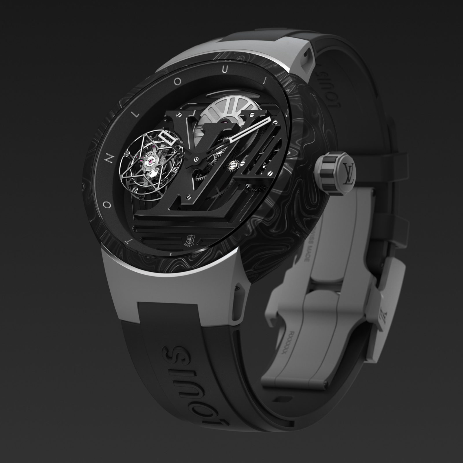 La partie externe du boîtier est réalisée en Carbostratum®, un matériau composite unique développé pour Louis Vuitton. Sa fabrication demande plus de 100 couches de carbone de tailles différentes, appliquées de manière aléatoire. L’ensemble constitué est alors mis sous pression à une température régulée.