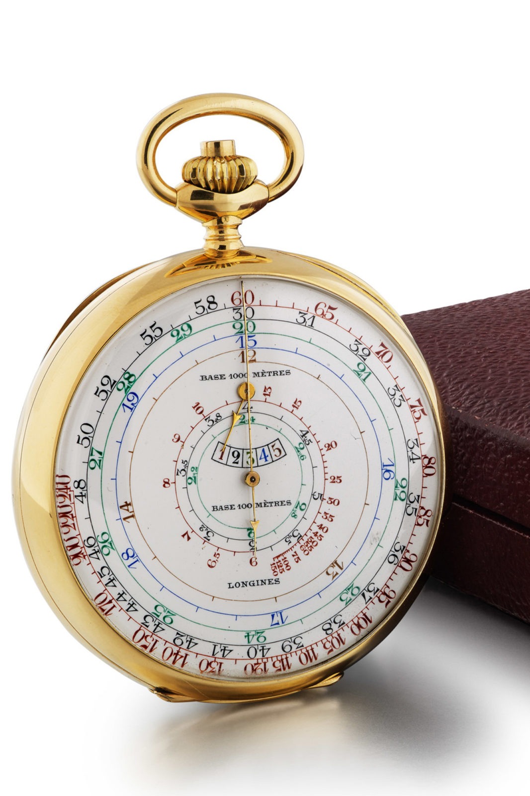On trouve au dos différentes informations liées au premier cadran. Tout d’abord, une indication au 5ème de seconde avec une double échelle télémétrique, de base 100 et 1000 mètres. Au centre, on trouve un compteur des 5 premières minutes. Fait amusant, on remarque que le verso de cette montre de poche servait à mesurer des vitesses supérieures à 240 km/h, probablement réservé à des mesures dans le domaine de l’aviation à l’époque dans les années 1930.