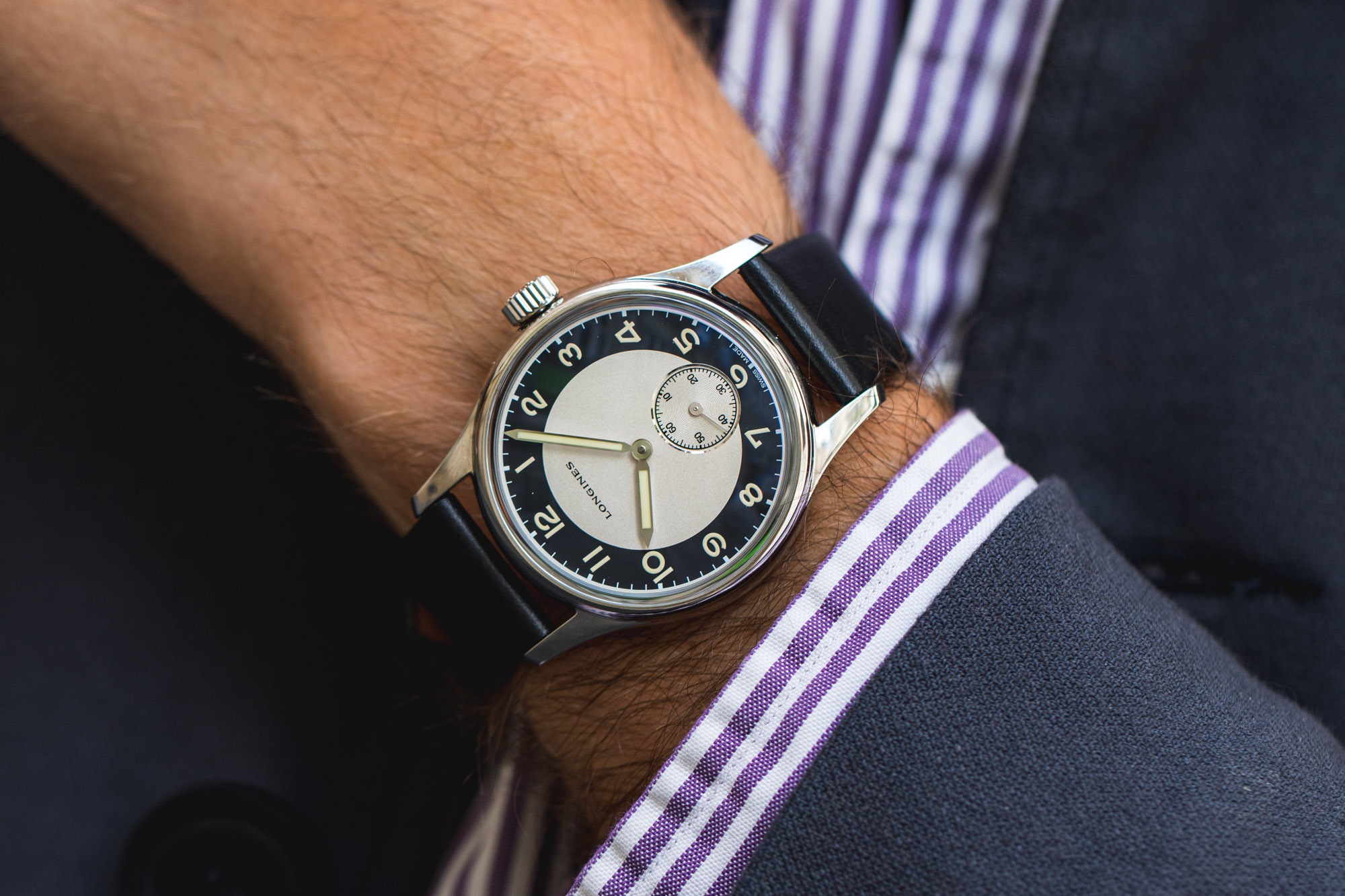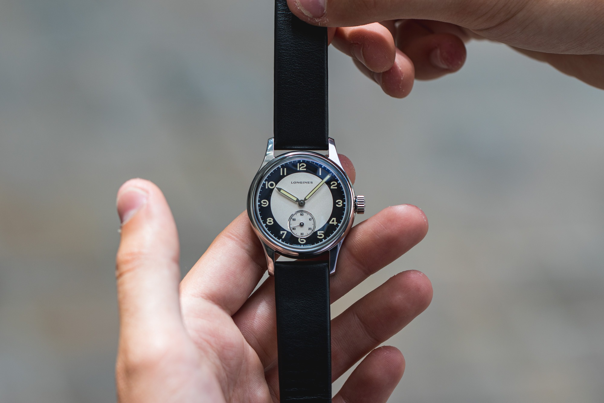 C’est un peu dans cette atmosphère qu’apparaît notre trois aiguilles Longines au cours des années 1940. N’allez pas jouer au jeu des sept différences, en substance il s’agit d’une ré-édition fidèle à l’originale, qu’il s’agisse des codes couleur, du design de la boite et la composition du cadran. À quelques détails près, comme toujours.