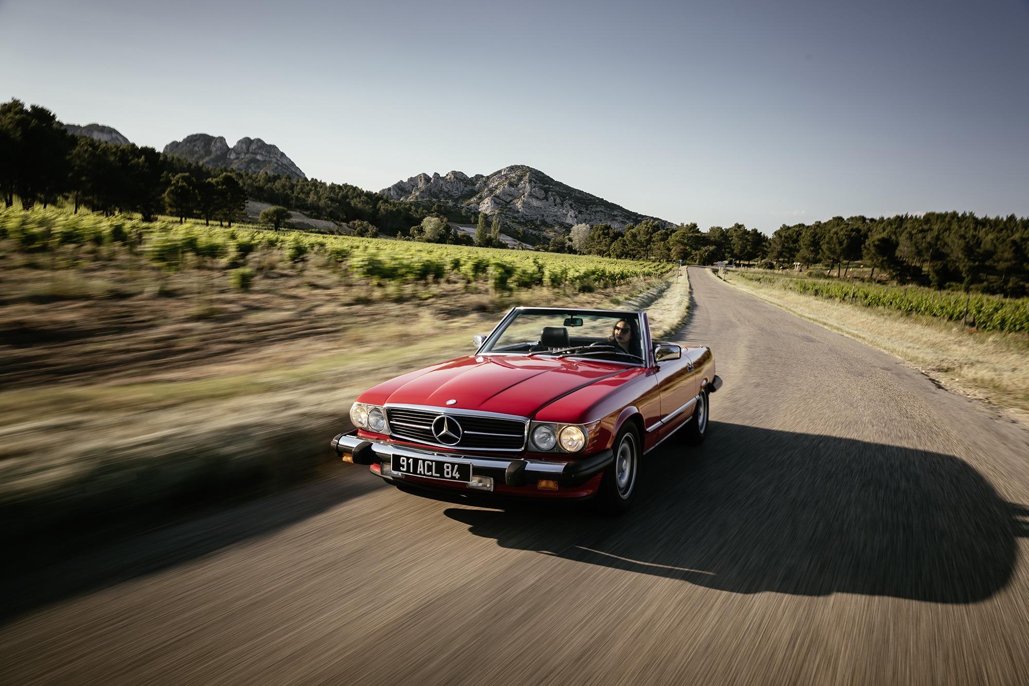 Revenue sur les petites chaussées, elle invite à s’arrêter dans des endroits chics. Une petite timidité vient alors poindre. Ses bourrelets de caoutchouc donnent des complexes. Bien sûr, il serait difficile de frimer avec dans des rassemblements de collectionneurs pointilleux. Pour le moment, du moins. Dans 10 ou 15 ans il faudra en reparler. Surtout que la cote est en train de grimper en flèche. S’il convient d’être prudent avec des autos importées pour moins de 10 000 euros, certains exemplaires parfaits s’échangent déjà plus de 60 000 euros. Ce cabriolet est encore un peu dans l’ombre, mais le coup de soleil ne va pas tarder. Aux abords d’un petit village de Provence, en stoppant dans un soupir devant une terrasse de café, l’émotion des passants est bien présente. La 560SL rouge attire tous les regards et entraîne de doux sourires. Soudain, une exclamation : « Whao ! C’est la voiture de Bobby Ewing ! ». Soudain, c’est l’Amérique.