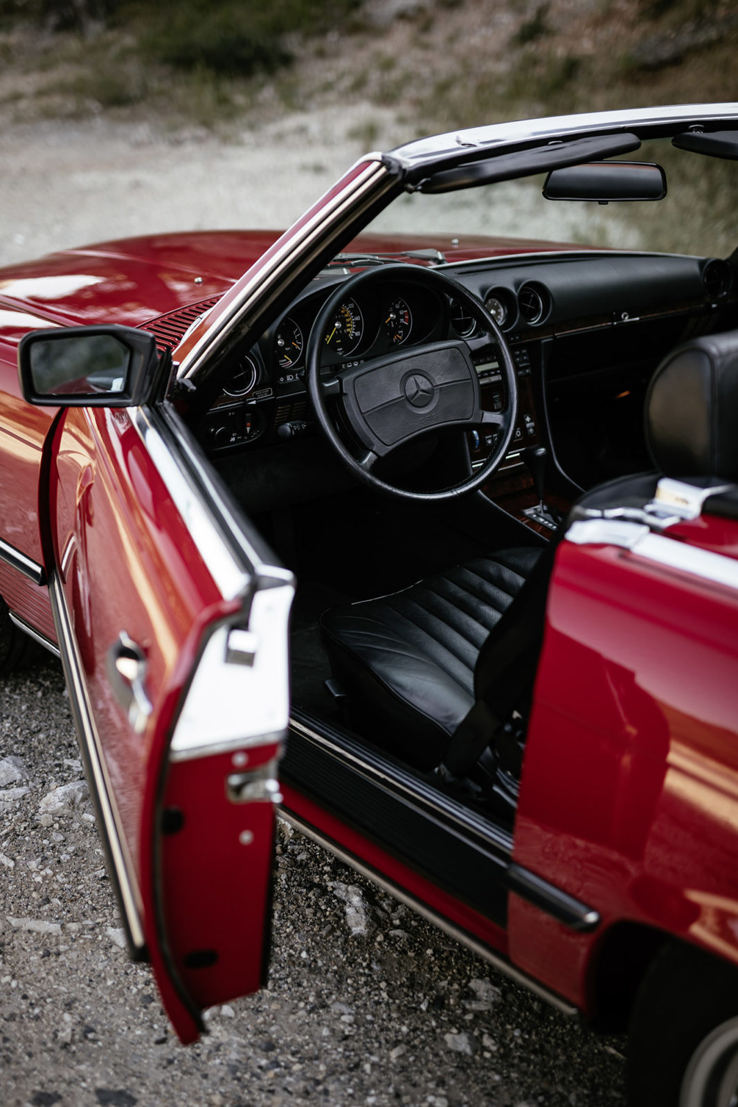 AMG ou Lorinser proposent des préparations musclées, et Koenig ira même jusqu’à greffer un compresseur portant la puissance à 320ch. Toutefois, tenter de chahuter une R107 sur des petites routes sinueuses et accidentées n’est vraiment pas la chose à faire. En revanche, bien installé derrière le grand volant posé légèrement de biais, chausser ses lunettes de soleil et profiter du feulement du vent dans les cheveux est un délice. En dépit de la pureté du profil, sans déflecteur latéral ni arceau, les courants d’air et autres tourbillons ne s’invitent pas à bord. Farrah Fawcett pouvait craquer sans risques : le brushing californien est sauf.