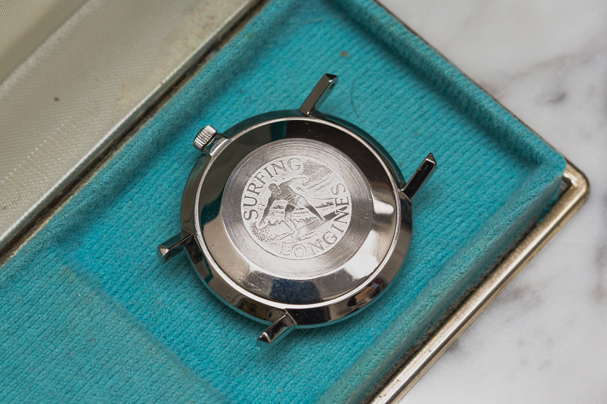 Il est toujours un grand plaisir de découvrir des « petites » montres avec un gros supplément d’âme. Cette Longines en fait indéniablement partie. Au premier regard, une belle et fine montre en acier, des années 1960, très sport et classique. Au deuxième regard plus attentif, la mention « Surfing » à six heures et une gravure au dos présentant un surfer sur une vague. Inattendu pour une montre Longines, non ?