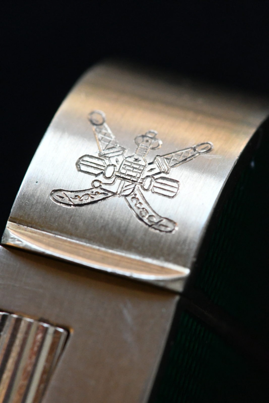 Ce modèle en or 18k a été produit en complément du modèle Elipse par Patek Philippe. Mais qu’est-ce qui rend ce modèle encore plus spécial et rare ? Vous le voyez bien, il s’agit de l’emblème national d’Oman gravé sur la tranche. Grâce à la structure des feuilles vertes et au contraste de l’or, ce briquet est une pièce de collection unique.