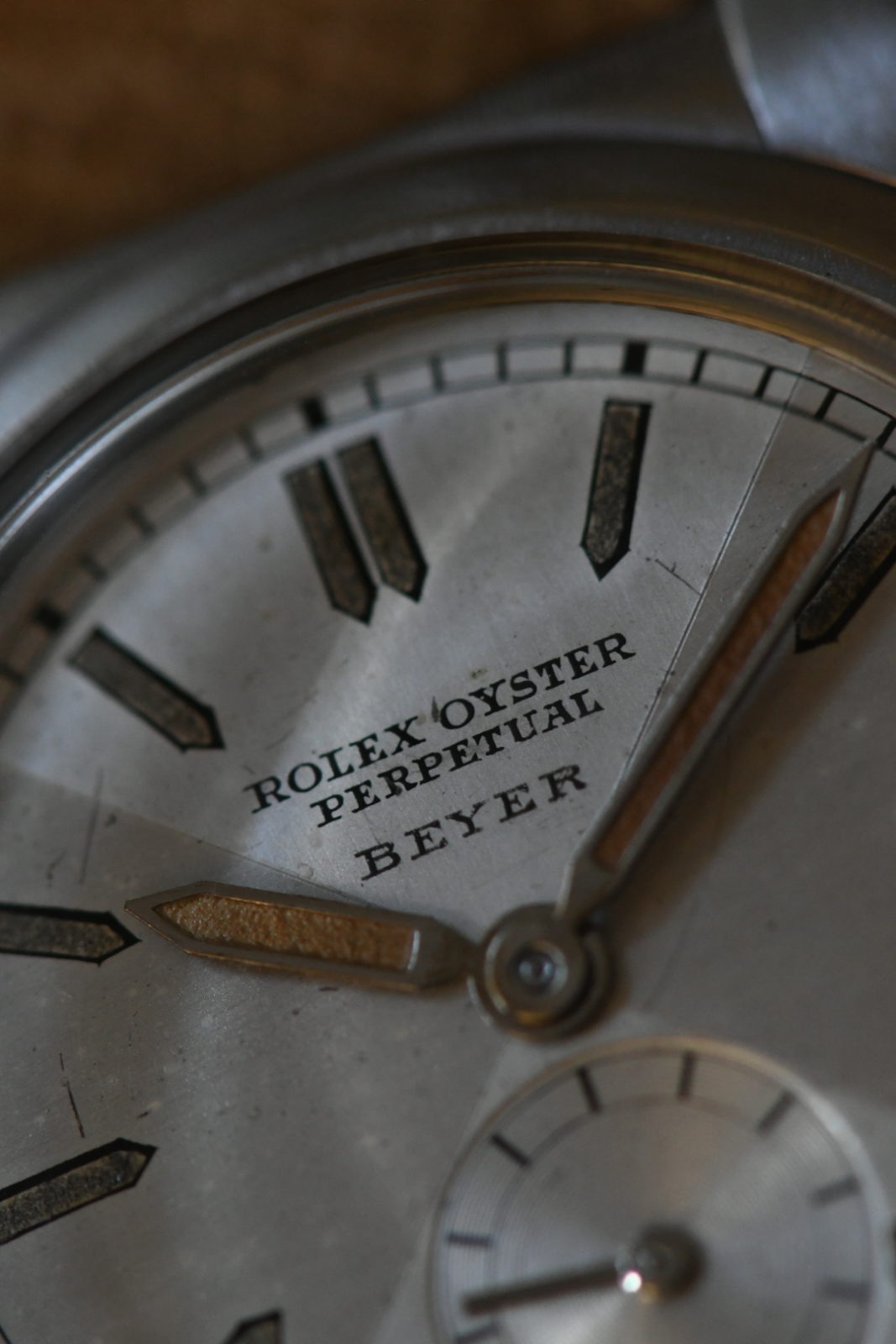 En tous cas, il y a un petit détail que vous ne devez pas oublier. Le grand nom d’un détaillant suisse est mentionné sur le cadran et il n’est autre que BEYER. Pourquoi trouve-t-on parfois le nom de détaillants connus sur les anciens modèles, chose moins fréquente sur les modèles actuels ? Autrefois, les marques de montres n’étaient pas aussi respectées et connues qu’aujourd’hui. Les concessionnaires l’étaient, car ils avaient du prestige dans leur région. C’est pourquoi le nom du détaillant figurait sur le cadran, car il était synonyme de qualité et de confiance. Cela a convaincu bon nombre de clients d’acheter de telles montres. Ces pièces portant l’emblème de détaillants renommés sont très recherchées. Une autre caractéristique de cette montre est ce qu’on appelle le « nœud papillon », que l’on peut voir sur le cadran, qui s’affiche plus fortement selon la lumière.