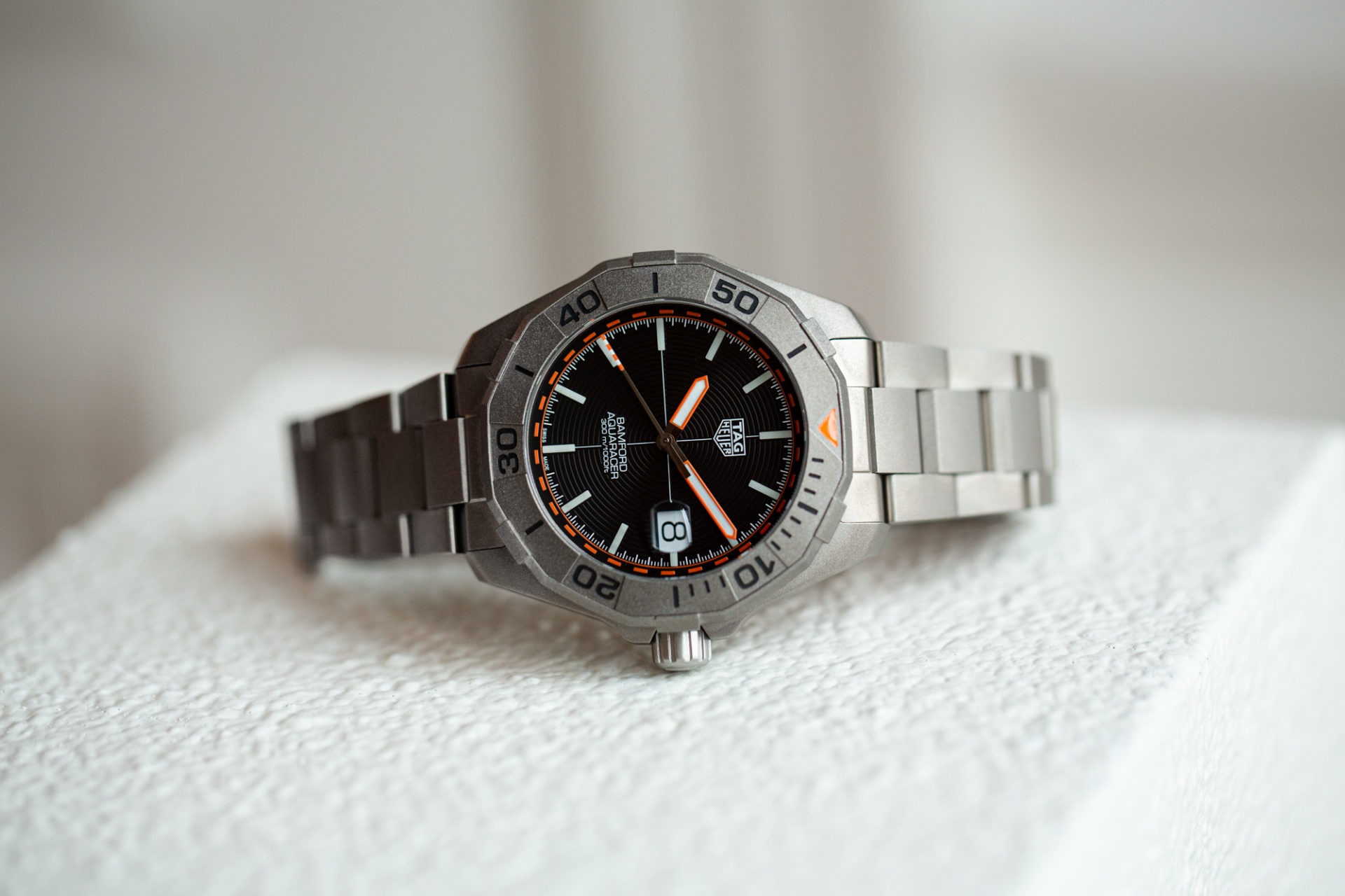 Bamford a pris ici comme base la bien connue montre de plongée Aquaracer de la marque avant d’y mettre sa touche. Tout d’abord, on remarque la finition du boitier, du bracelet et de la lunette satinés, réalisés en titane et apportant toute la légèreté dont la montre a besoin.