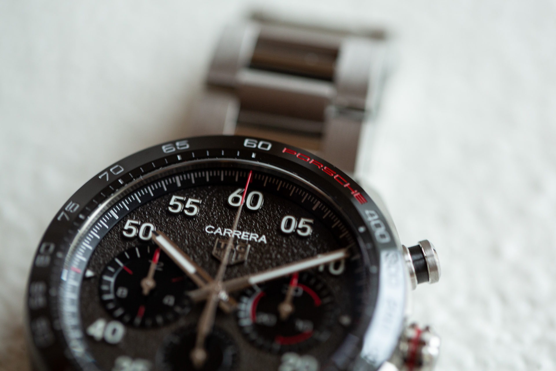 Aujourd’hui, nous découvrons la nouvelle montre qui s’associe à Porsche et qui n’est autre qu’une Carrera et ses 44 mm de diamètre. Mais ce n’est pas tout. D’une part le cadran dévoile des index en applique qui reprennent la police de caractère de la marque et font songer à un compteur, et il présente également une texture type « asphalte » et sur la lunette céramique, on peut lire « Porsche » à la place de « Tachymètre ».