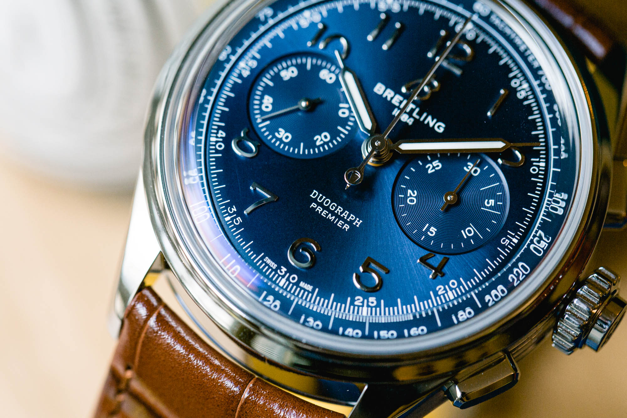 Pour signer son retour, la Duograph de Breitling se réinvente aujourd’hui dans le boîtier rond de 42 mm de diamètre au dessin classique et de bon aloi de cette nouvelle collection dite « Premier Heritage ». La gamme vient coiffer les pièces de la ligne Premier, équipées du mouvement manufacture B01, développées depuis quelques années, et qui n’ont cessé de surprendre agréablement par leurs références directes aux modèles anciens, sans se borner à être de simples rééditions body-buildées de références anciennes. C’est dans cette catégorie que la maison a récemment présenté des pièces comme l’édition limitée Top Time Deus, ou Wheels And Waves, et certaines variations au titre de son partenariat avec le constructeur automobile Bentley, telle les séries limitées Bentley Racing Green, Bentley Mulliner ou Bentley Centenary.
