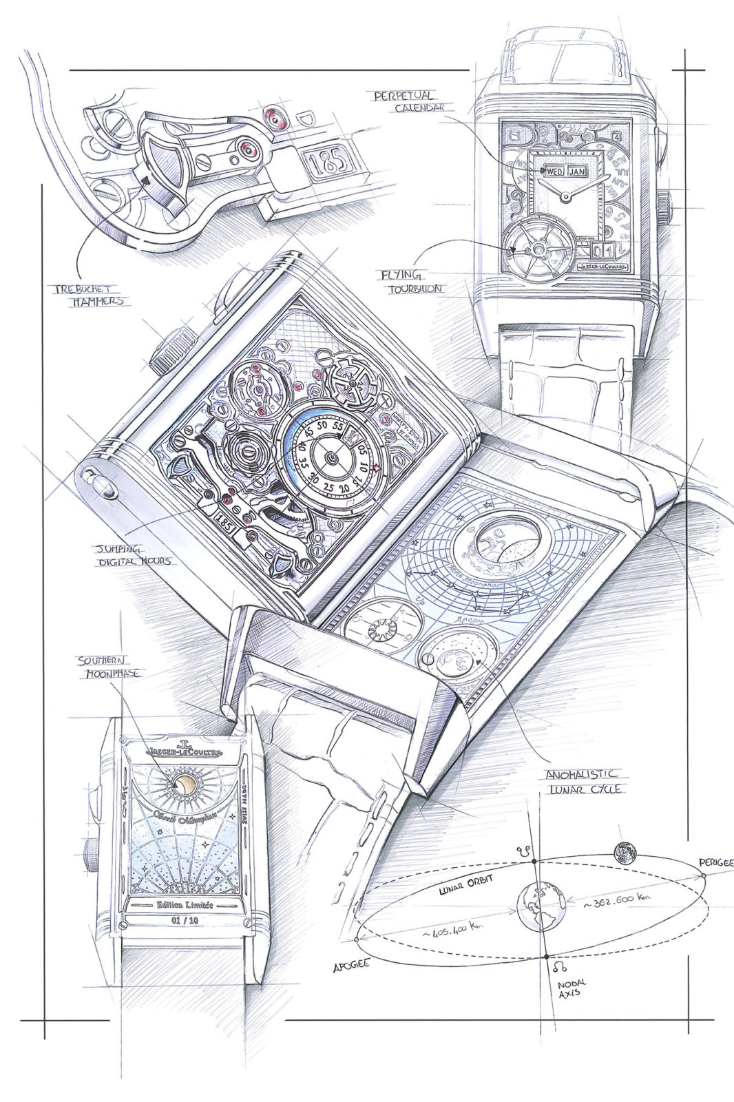En découvrant la Reverso Hybris Mechanica Quadriptyque, il est bien difficile de faire le rapprochement avec un terrain de polo. Imaginée en 1931 pour la pratique de cette discipline exclusive, la Reverso a inventé le principe même de la montre de sport élégante. Passé ce stade, elle est aussi devenue l’écrin de savoir-faire horlogers de pointe. Depuis les années 90, Jaeger-LeCoultre a agrémenté la Reverso d’un certain nombre de grandes complications. Parmi les plus remarquables, figurent notamment la Reverso Répétition Minute, animée par le calibre 94, qui introduisait, en 1994, le premier mouvement rectangulaire de ce type, ou bien encore la Reverso Gyrotourbillon, bénéficiant d’un tourbillon volant bi-axial. Plus spectaculaire, la Reverso Grande Complication à Triptyque de 2011 n’offrait pas moins de dix-huit fonctions, telles que l’affichage sur 24 heures, un calendrier zodiacal, une carte du ciel, la date rétrograde, l’équation du temps, l’heure sidérale, l’indication des heures de lever et de coucher du soleil, les phases de la Lune ou un quantième perpétuel. Le tout avec un seul mouvement, mais sur trois faces. En effet, le calibre 175 à tourbillon animant l’ensemble des fonctions était capable de transmettre son énergie aux indications placées sur le brancard.