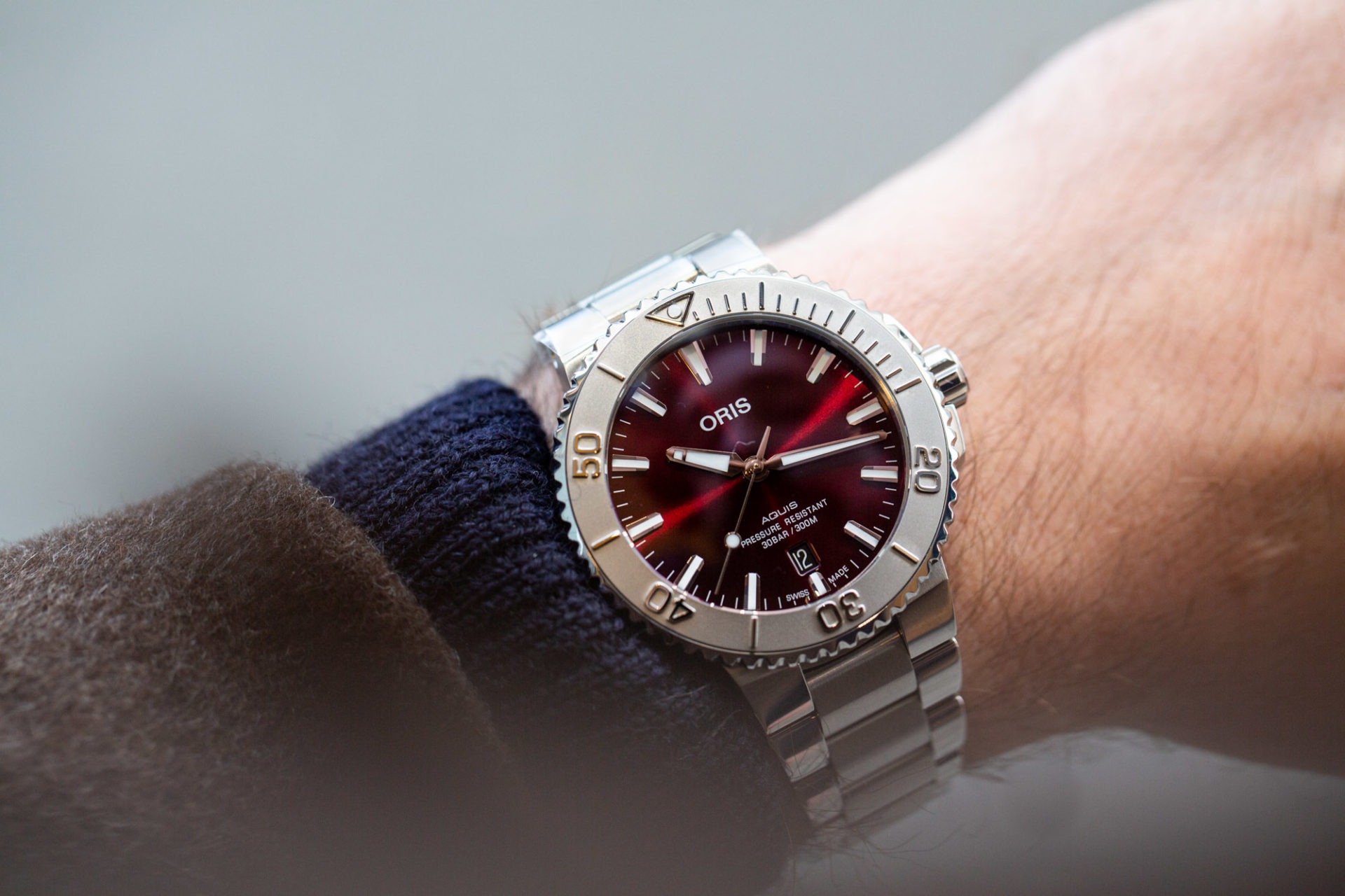 La dernière édition de Baselworld se tenait en 2019. À l’occasion, nous découvrions la Oris Aquis Date Relief. Vous vous demandez pourquoi je vous parle de ces temps « lointains » ? Cette nouvelle Aquis 41,5 mm au cadran cerise reprend la lunette de cette pièce de 2019 où les chiffres sont en relief.
