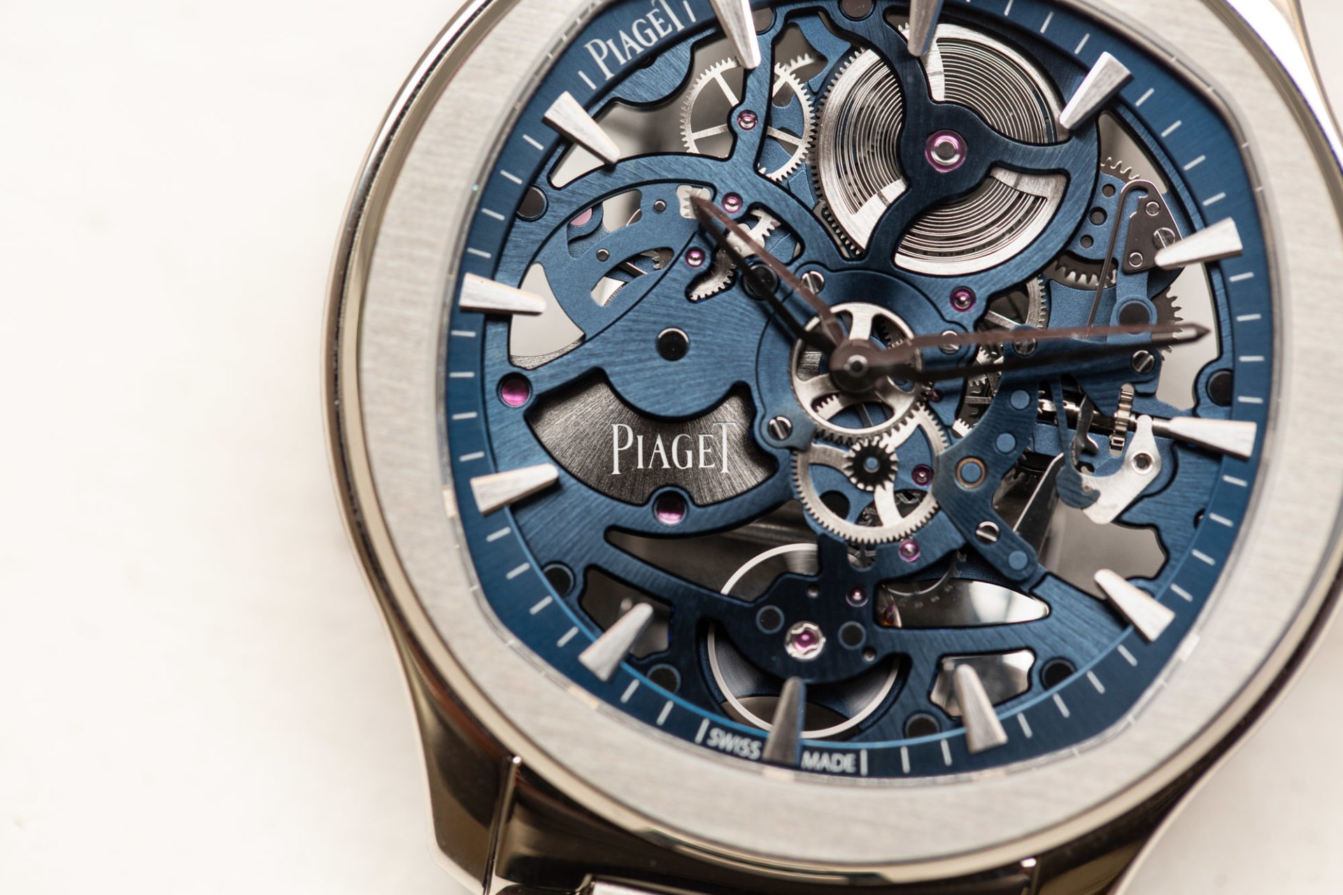 Sur la nouvelle Piaget Polo Skeleton, on trouve le mouvement 1200S1, une déclinaison du 1200S. Parmi la foule de détails que l’on peut prendre plaisir à observer, voici de quoi vous occuper : le blason de la marque gravé sur la masse oscillante, des roues cerclées et satinées soleil, une platine et des ponts satinés soleil, anglés également, des pieds de vis borgnes (regardez attentivement l’arrondi poli du pied de vis), des fentes anglées. Voilà qui devrait vous rassasier.