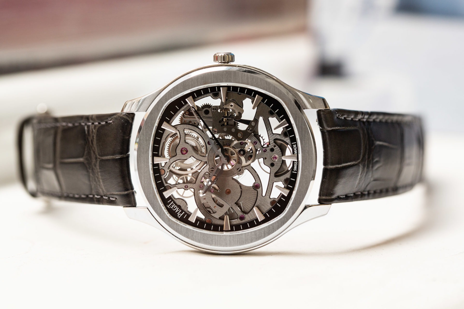 Et puis, tant qu’à faire, si une nouvelle montre se développe depuis l’esprit des designers et ingénieurs chez Piaget, autant accompagner cette prouesse squelettée d’une belle dose de finesse ! Sur cette Polo Skeleton, le boitier est plus plat de 30% par rapport aux versions existantes, et il a fallu pour cela faire évoluer le mouvement qui s’y dévoile.