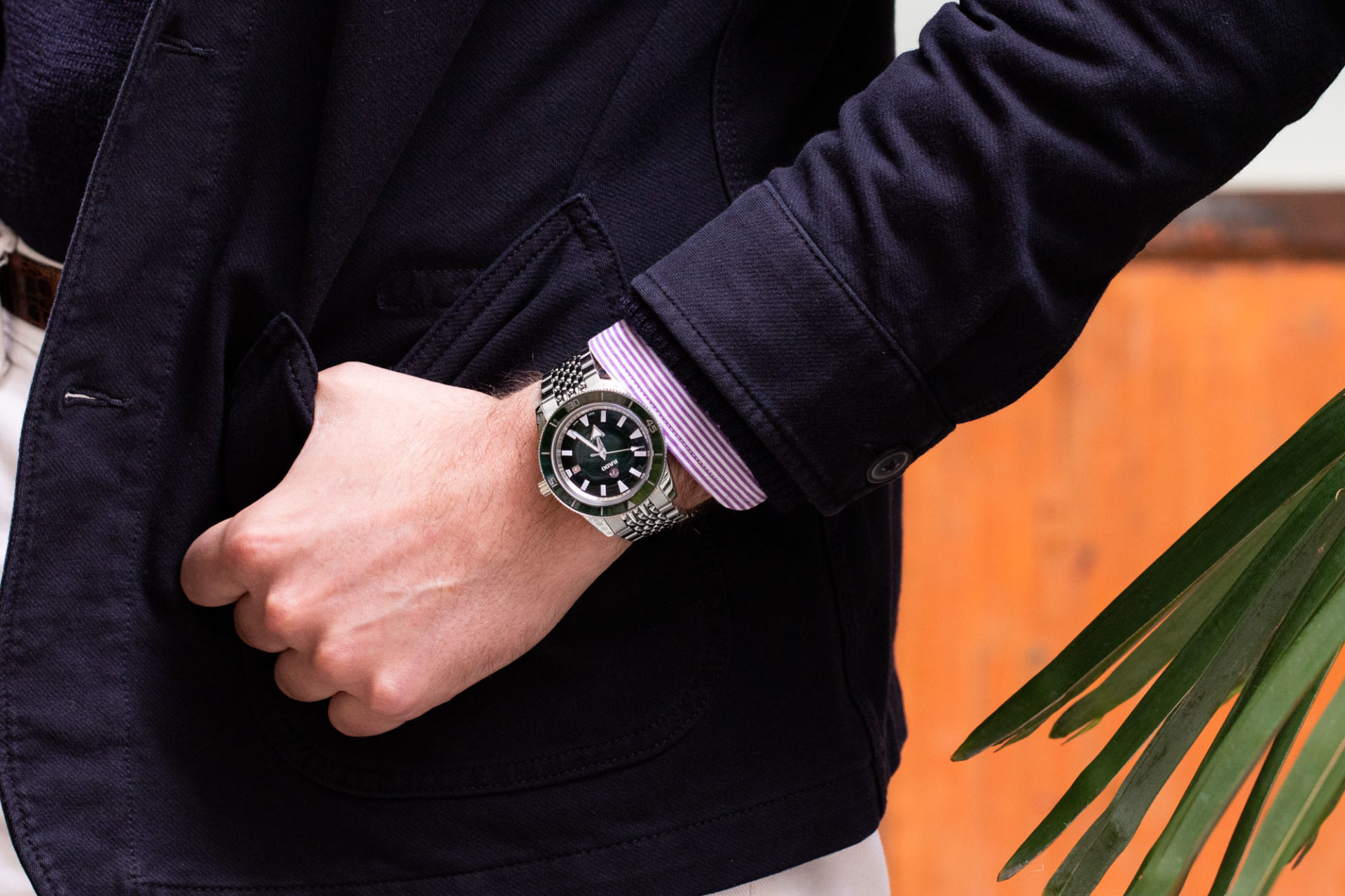 La céramique si chère à Rado se retrouve sur l’insert de lunette, toujours incurvé et qui donne (presque) toute son identité à la montre. Trois coloris sont disponibles, le bleu, le vert (celle que nous vous montrons ici) et une grise.