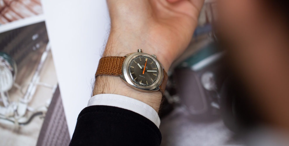 Un chronographe mono-aiguille sans compteurs des minutes ou secondes, présentation peu commune sur les montres-bracelet de la fin des années 60.