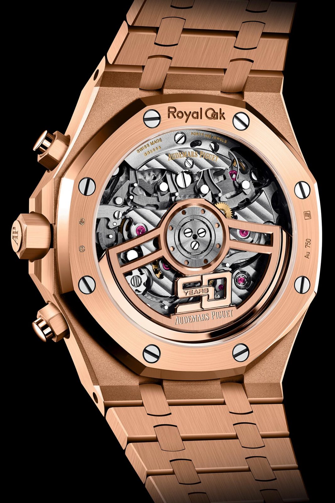 On retrouve le calibre 2385 pour les chronographes en 38 mm de diamètre. Avec ce diamètre, la montre est proposée avec un fond plein signé de la mention Royal Oak.
