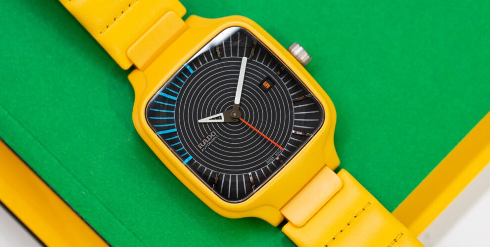 Pour cette Rado True Square, l’inspiration s’est aussi abreuvée de science fiction. On imagine les combinaisons jaunes d’aventuriers de l’espace avec leur aspect matelassé, ou encore du mobilier de vaisseau spatial qui reprendrait les mêmes formes que l’on pouvait trouver dans le mobilier des années 1980 ou sur la sellerie des célèbres Porsche 928.