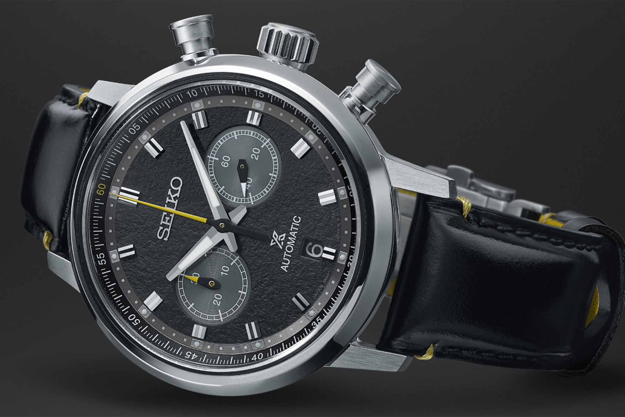 Une pièce dont on apprécie beaucoup le cadran. Un cadran à motif sablé, qui rappelle la piste de course, dont la trotteuse, l’aiguille du totalisateur des 30 minutes à neuf heures s’habillent de jaune, la couleur des appareils de chronométrage et de mesure Seiko.