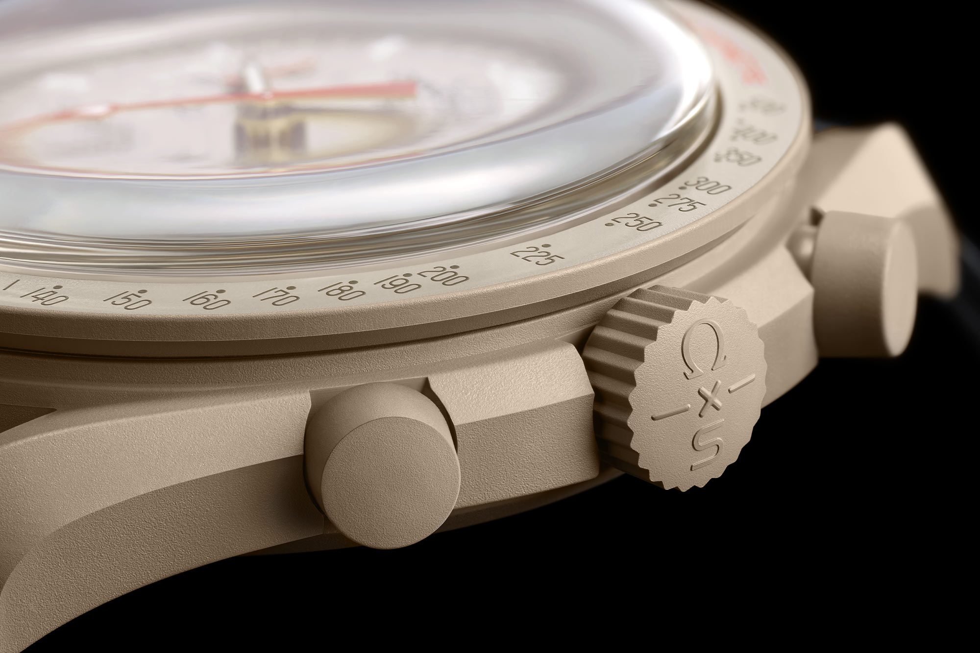 Techniquement, Omega et Swatch nous proposent l’adaptation du boîtier de la Speedmaster en conservant la taille de 42 mm par 13.25 mm d’épaisseur. Le boîtier est dans une matière appelée bioceramic : un alliage de céramique et de plastique recyclé. Les boîtiers et lunettes se parent de onze couleurs correspondant chacune à une planète ou satellite.