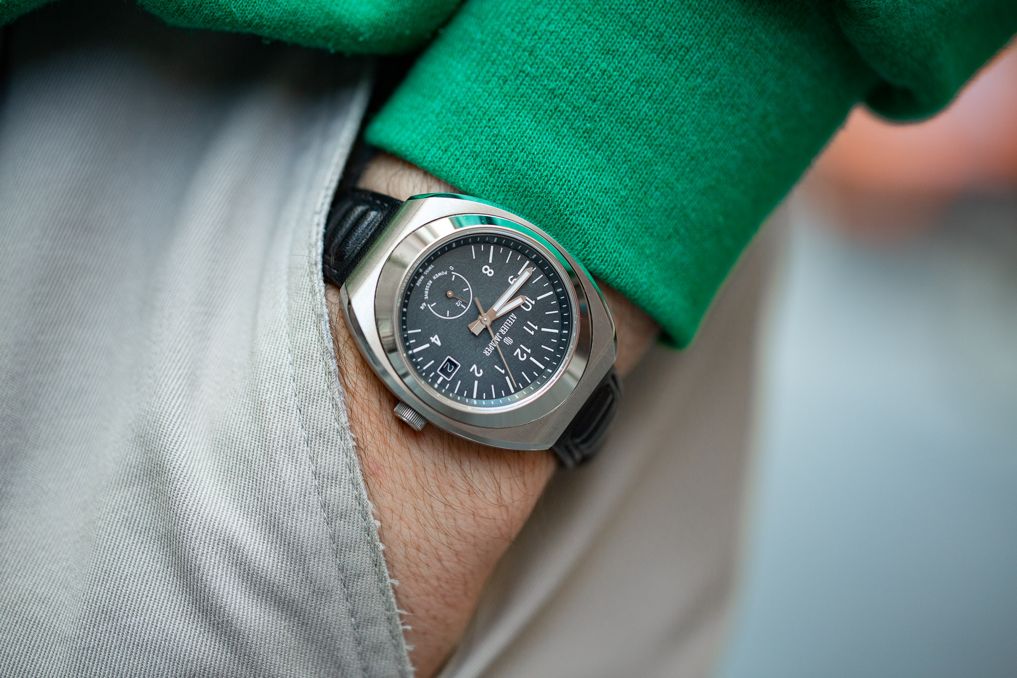 Les détails du cadran ne décevront pas les amateurs. Il nous renvoie aux deux gros compteurs de la Miura (à l’époque fabriqués par Jaeger) et à leur structure. Ici seulement, pas de tours minute, mais des chiffres arabes peints avec leur repères plus longs. On remarque la date à trois heures, et à six heures pas de petite seconde (ici centrale) mais une réserve de marche qui cache l’autre détail intéressant de cette pièce : le mouvement.
