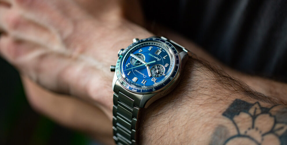 Pour tout le reste, on apprécie la lunette toujours fine avec l’insert en céramique ici bicolore noire et bleue et l’échelle tachymétrique, qui vient décorer le boitier avec ses alternances de finitions brossées et polies. Un brossé circulaire sur les cornes, horizontal sur la carrure, sans oublier la belle signature Depancel du chanfrein poli qui court tout le long de la montre. Des détails poussés à la couronne facettée avec une petite bande bleue, toujours un clin d’oeil à la couleur de la petite sportive, jusqu’aux poussoirs ronds et rainurés, en songeant forcément à des chronographes Rolex des années 1960, mais aussi à la segmentation des pistons. Un boitier qui affiche un diamètre de 43 mm pour 15 mm d’épaisseur et qui par son travail rigoureux ne parait pas hors de propos même sur un poignet moyen.