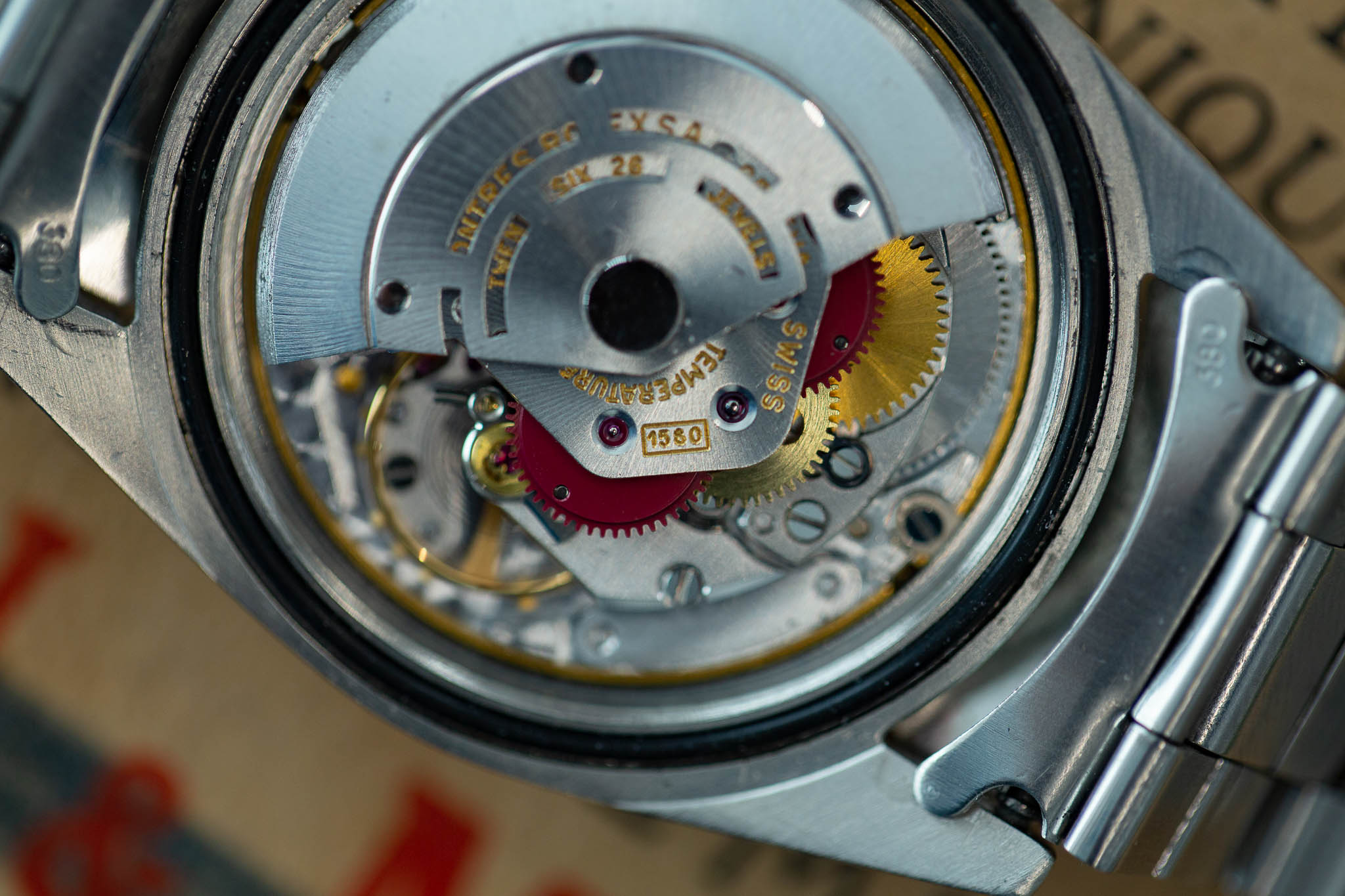 En ouvrant la Rolex Milgauss référence 1019 proposée par l’Atelier des Tocantes, on remarque plusieurs choses intéressantes. Tout d’abord tout ce qui a trait à l’antimagnétisme, j’entends par là la petite cage couleur métal jaune qui enveloppe le mouvement pour le protéger des méchantes ondes, mais également l’autre petit système intégré au fond de boitier. Autre détail, en plus de lire la référence gravée sur le fond de boite, on y lit aussi, comme cela était le cas jusqu’au début des années 1970, le trimestre de sortie des ateliers, ici III 68 pour troisième trimestre de l’année 1968. On découvre le calibre 1580, un mouvement intéressant car il n’est autre qu’une évolution amagnétique du calibre 1570, lui même fondé sur le bien célèbre 1530 présenté à la fin des années 1950. Il est, tout comme ses confrères, certifié Chronomètre.